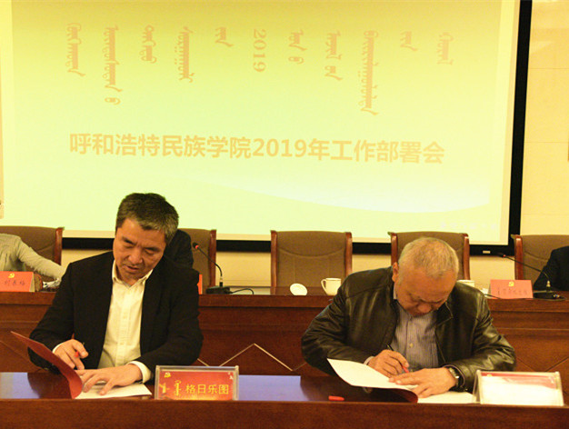 为推动各项工作责任制落实,会上进行了“责任状”签字仪式。孙国权书记分别与校领导、各单位各部门负责同志代表签订了“一岗双责”、党建、意识形态、党风廉政建设、综合治理、保密等工作责任状,格日乐图校长与各单位各部门代表签订了消防安全工作责任状。