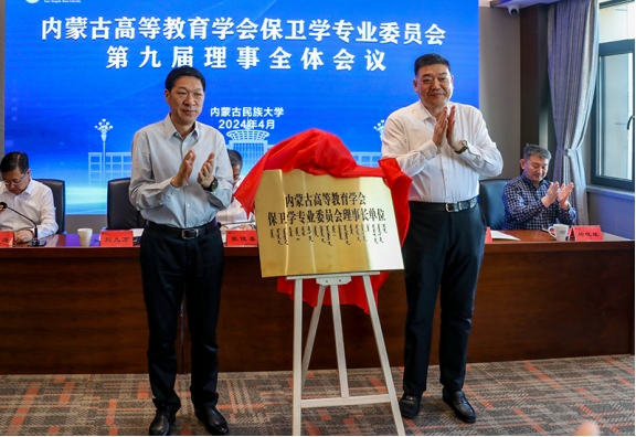 第八届理事会理事长、米乐官网党委书记刘九万和第九届理事会理事长、内蒙古民族大学党委书记赵东海共同为内蒙古高等教育学会保卫学专业委员会理事长单位揭牌。