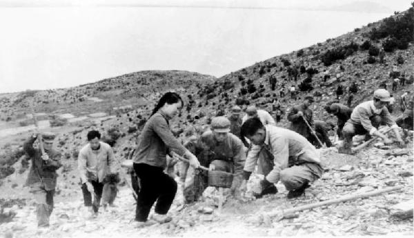 谷文昌(前排右一)与当地群众在荒山石滩造林。(漳州市纪委监委供图)