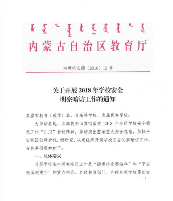 根据《自治区教育厅关于开展2018年学校安全明察暗访工作的通知》(内教校安函[2018]12号)要求,结合我校安全工作实际,现决定开展全校安全工作大检查。具体事宜通知如下: