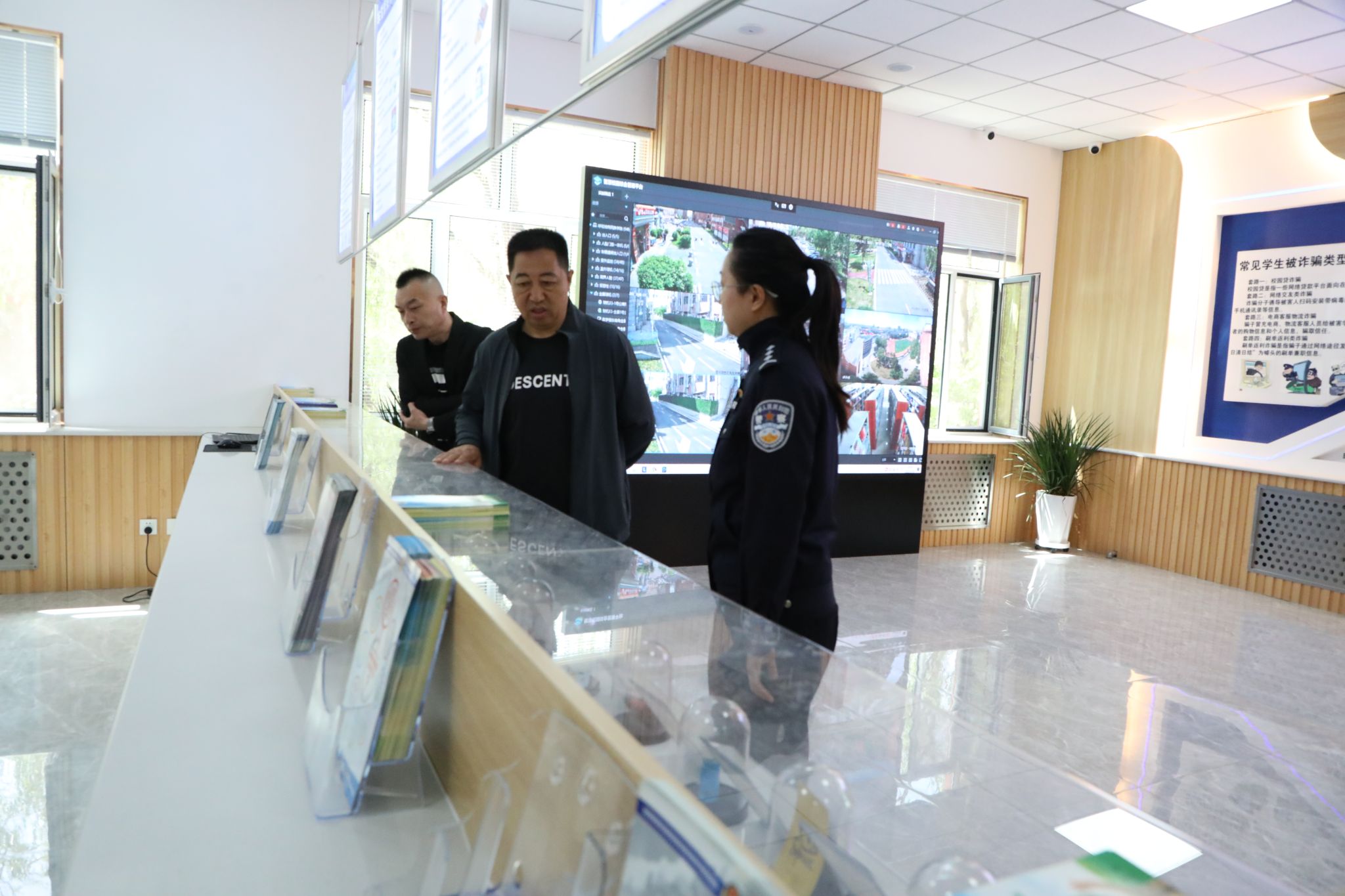 郭月旺详细了解了警务室宣传、服务、调解三大职能区域的设施配备及整体运行情况,着重询问了联防联控、应急处置、服务师生等方面工作的具体开展情况,并与关荣就校警联动机制、平安校园建设工作进行了交流讨论。