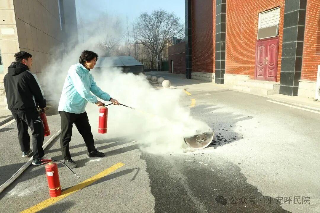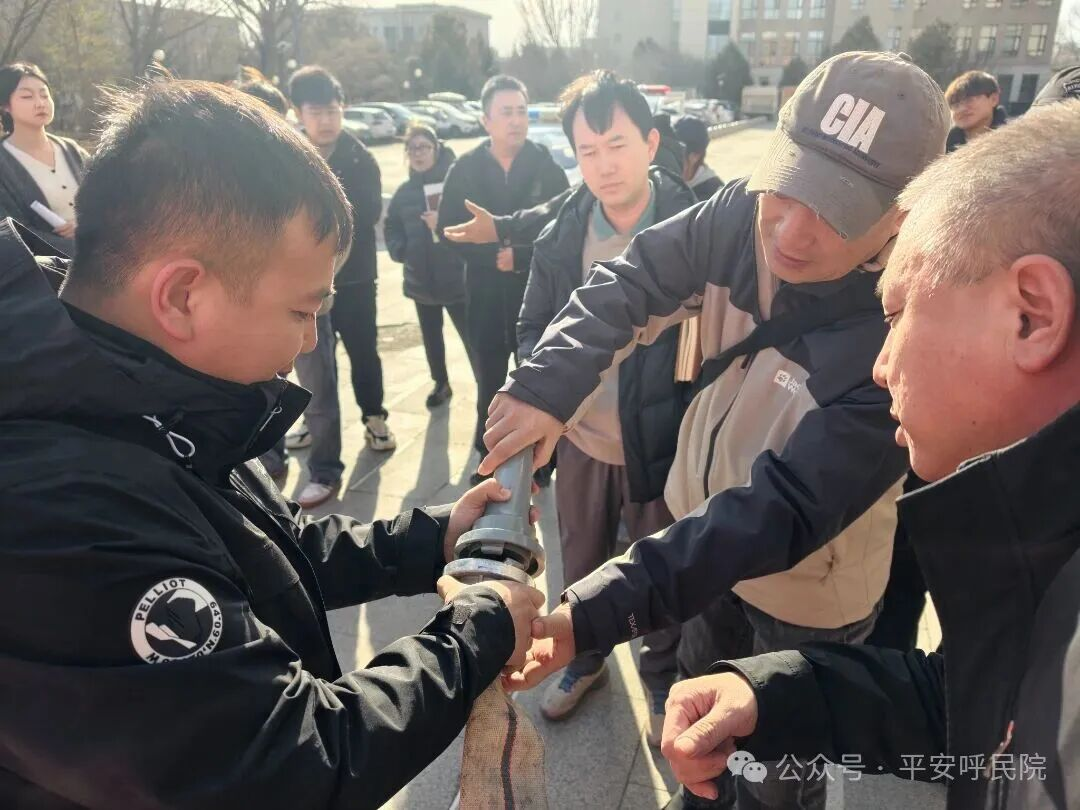 理论讲解结束后,在综合楼外进行实操演练。周教官现场演示了灭火器“提、拔、握、压”的操作要领,同时重点演示了消火栓开启、水带连接、握持水枪精准喷射、扑灭初期火灾的完整过程,随后,教师代表纷纷进行实操练习,切实将理论知识转化为实践技能,增强了应急处置实战能力。