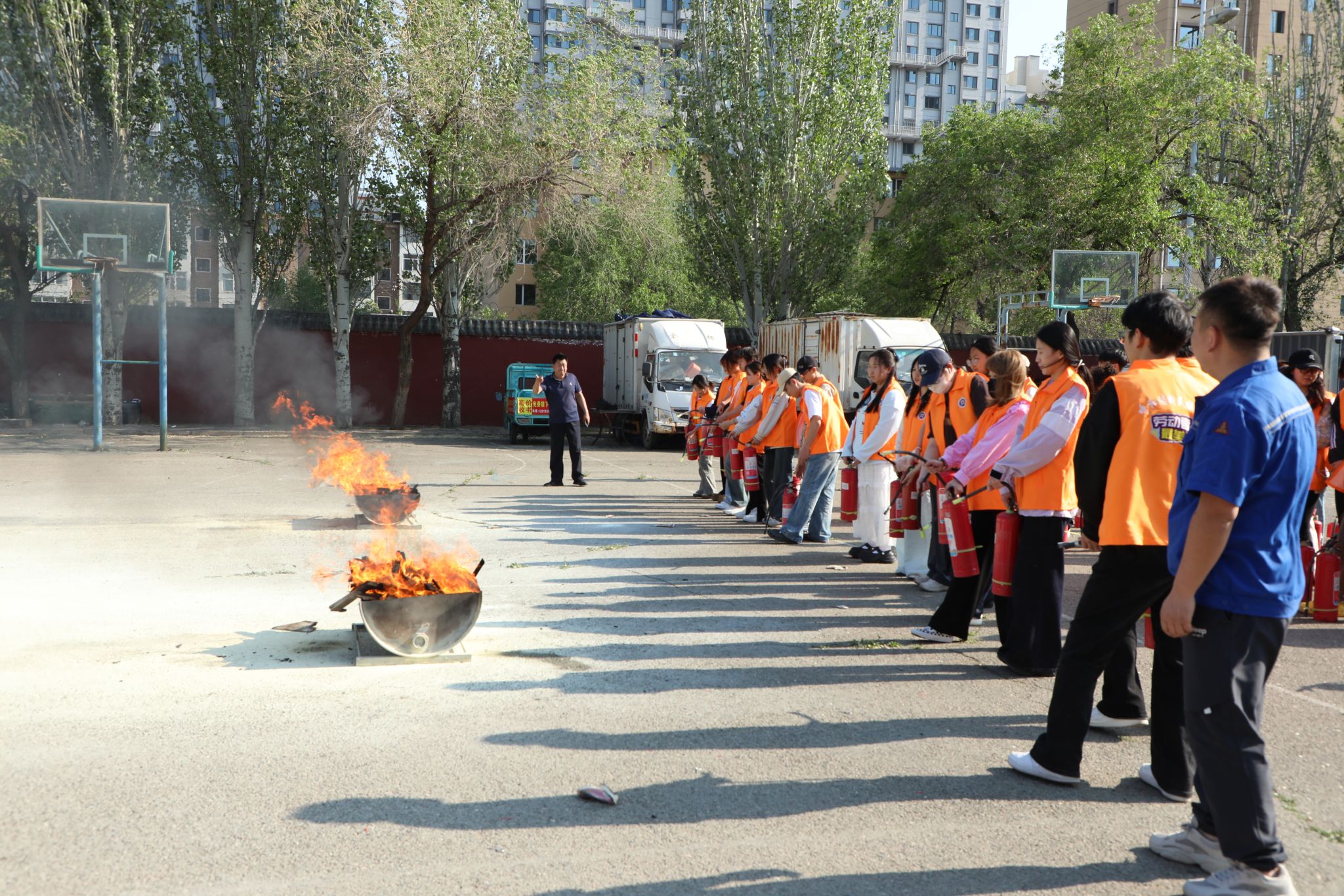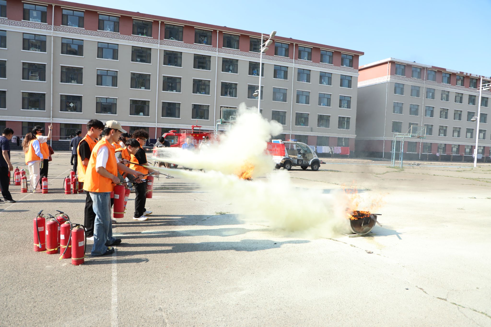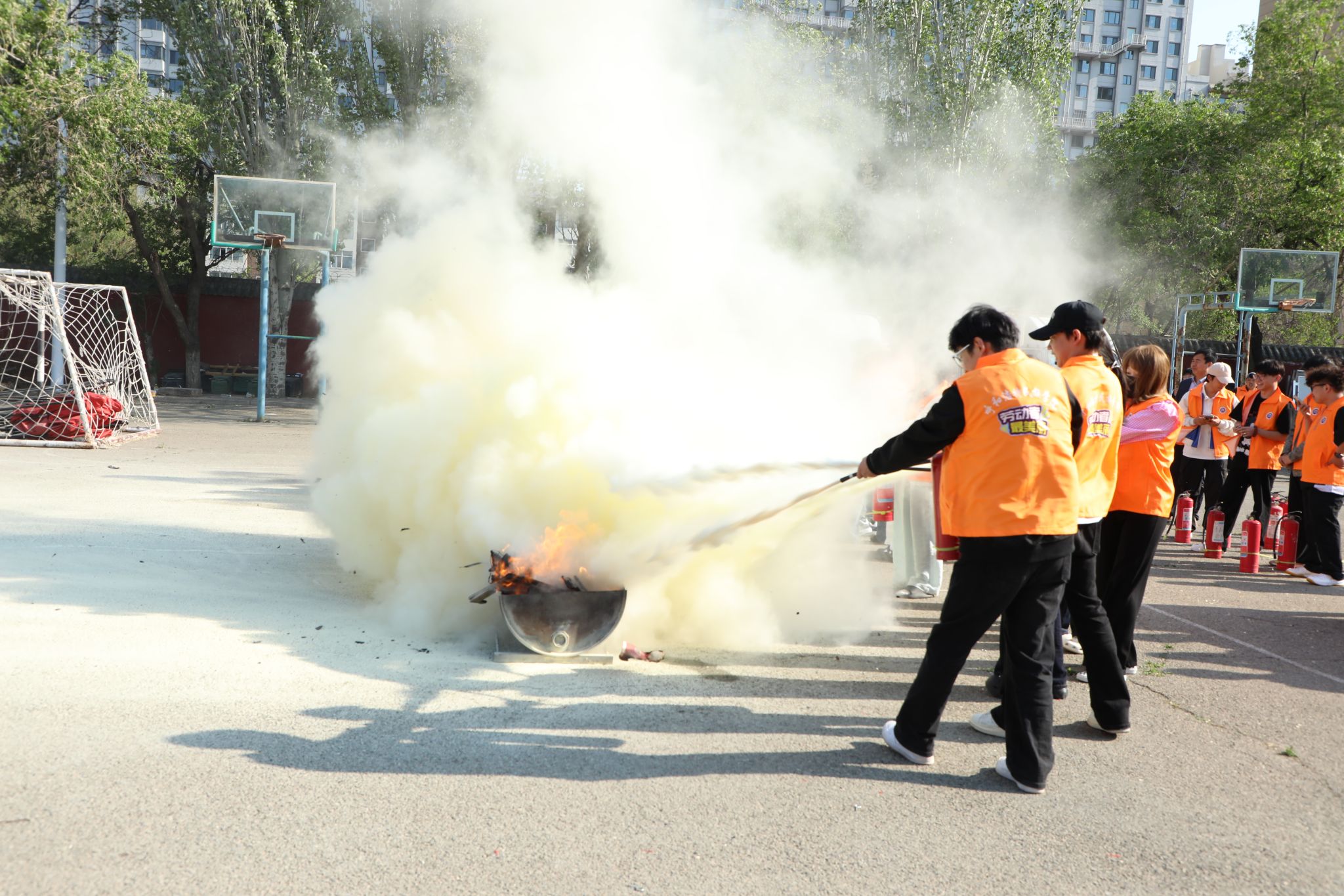 首先,周老师为大家详细讲解了灭火器 “一提、二拔、三握、四压”的操作要领并进行现场演示,同时强调了使用灭火器过程中的注意事项。随后模拟初期火灾场景,周老师指导同学们亲身体验灭火器实操过程,学生们反复练习,在动手操作中掌握应急灭火技能,同时深刻体会到消防工作的专业性与严谨性。
