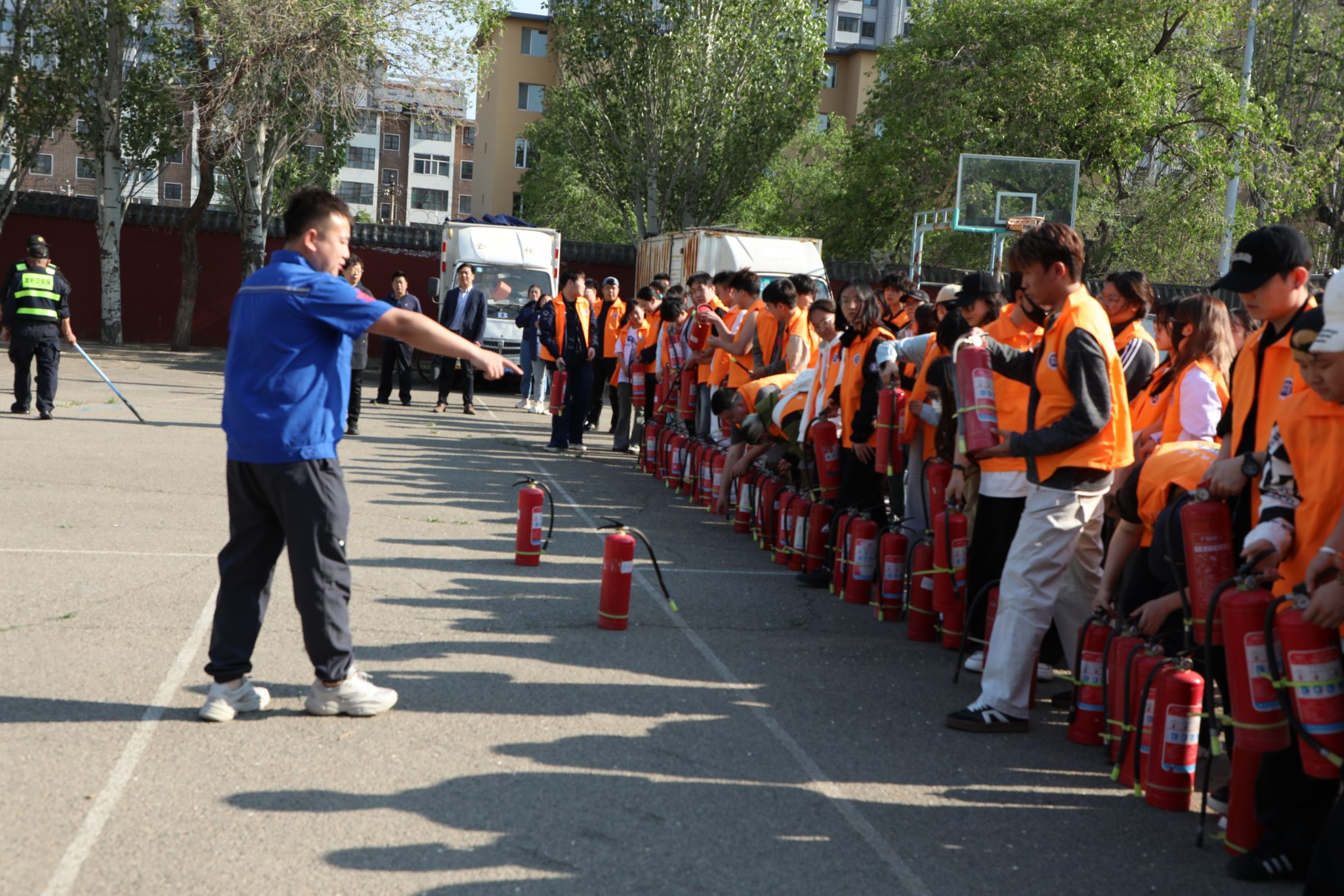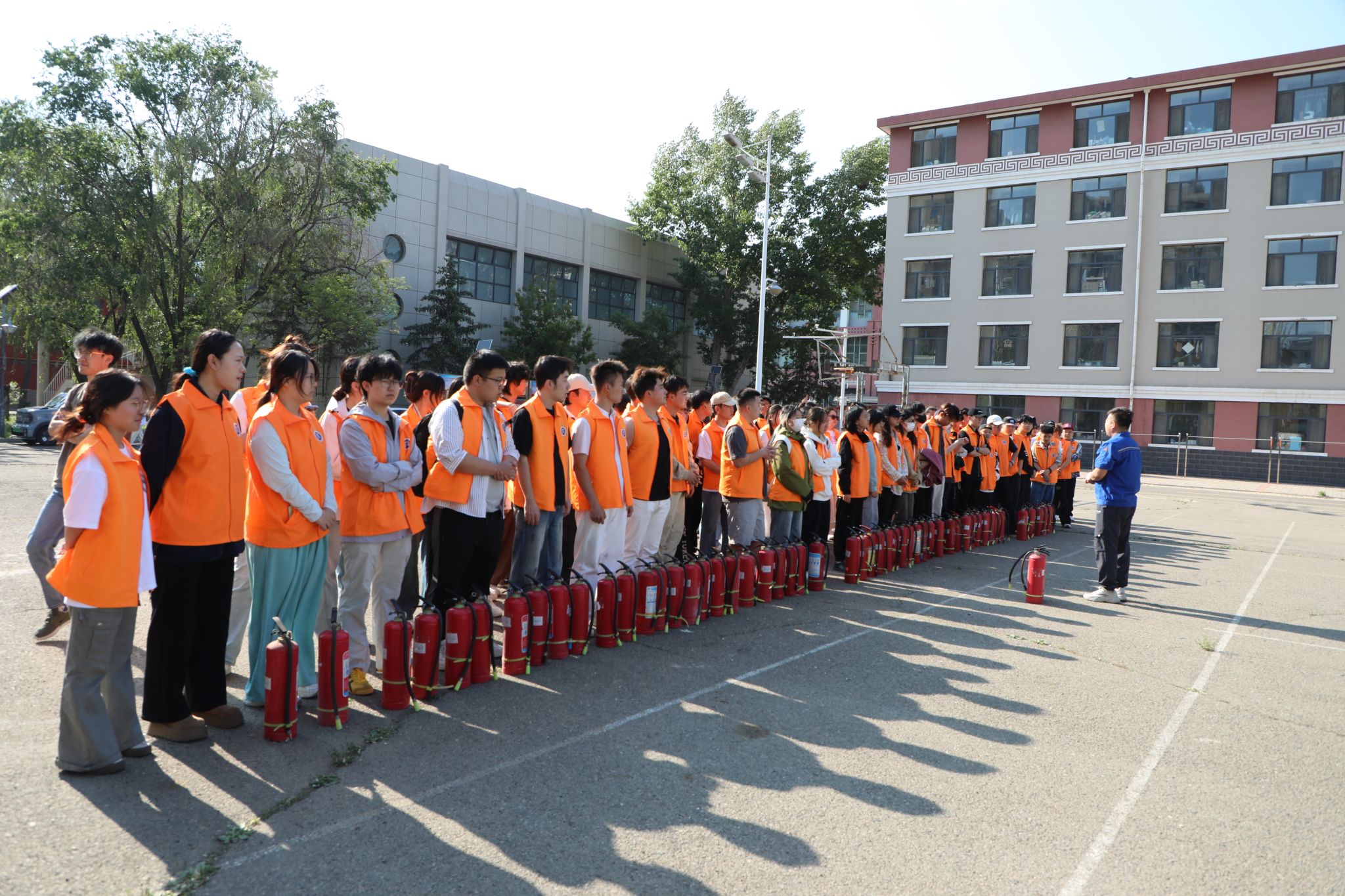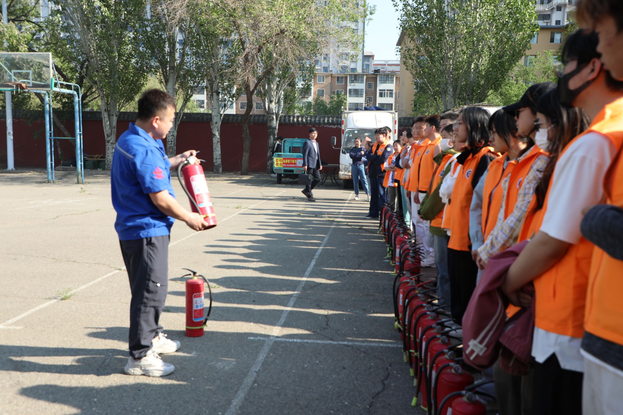 为深入贯彻落实劳动教育宣传月工作要求,强化学生安全防范意识及劳动实践能力,进一步提升学生应急处置能力,5月14日下午,安全管理处配合教务处在十号学生公寓前广场开展了“技能锤炼展风采 劳动教育育新人”主题消防安全体验课堂,参与活动的师生约150余人,活动邀请学校消防维保单位专业技术人员周志远担任讲师。