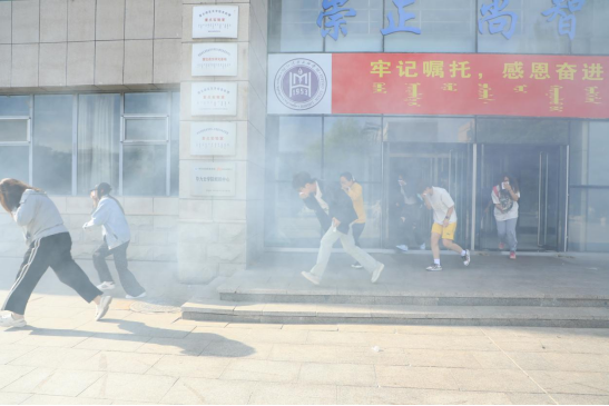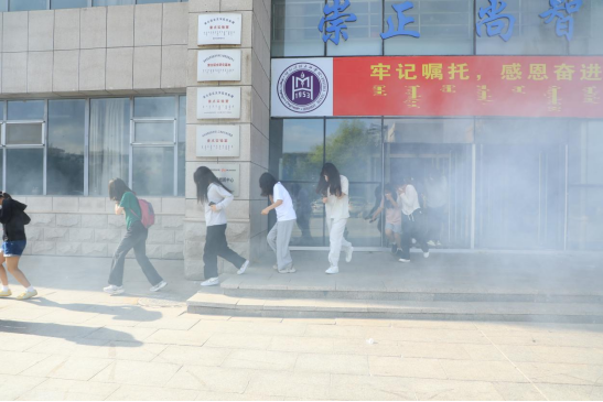 理论培训后,在综合楼模拟火灾进行逃生演练,警报声响起后,师生们迅速按照应急预案要求,用湿毛巾捂住口鼻,弯腰低姿,沿着预定疏散路线有序撤离实验室。