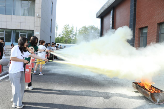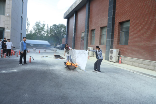 随后,在综合楼前广场开展实操演练。邹教官详细讲解并现场演示灭火器“提、拔、握、压”四步操作法以及灭火毯的正确使用方式,在邹教官的指导下,师生们积极参与灭火实践操作,扑灭模拟火源,在实践中巩固消防知识技能。