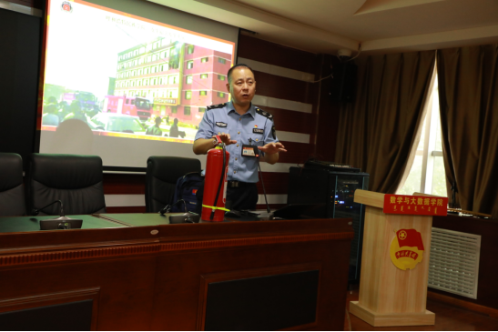 邹教官以防范火灾风险,建设平安校园为主题,结合近年来全国高校典型火灾案例,用通俗易懂的语言深入讲解了火灾发生的原因、危害及预防要点。他指出,高校宿舍违规使用大功率电器、实验室操作不当、消防通道堵塞等行为,是引发校园火灾的主要隐患,必须时刻警惕。在火灾应急处置环节,邹教官重点演示了灭火器、灭火毯等常用消防器材的正确使用方法,详细讲解了火灾初期扑救技巧、浓烟环境下的逃生自救方法以及疏散逃生时的注意事项,特别提醒师生在逃生过程中要保持冷静,避免拥挤踩踏,优先选择安全通道撤离。