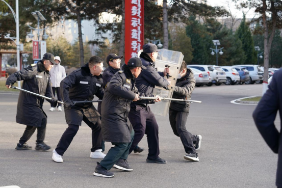 海东路派出所两位警官为大家讲授钢叉防暴盾、应急棍等常用安保器械的规范使用方式及如何快速组成最小作战单元的技巧方法。随后,安保人员有组织进行应急棍、防爆盾、叉等器材的协同配合训练并进行反恐防暴模拟演练演练中,安保队伍利用盾叉结合、缓步推进和冲击前进等战略战术制服“暴徒”。