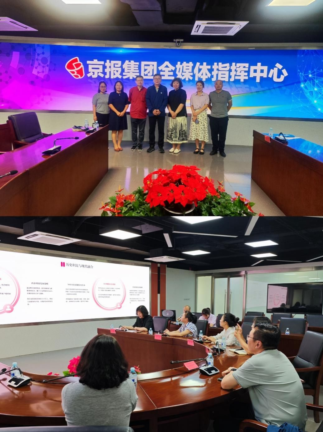 在京报集团全媒体指挥中心,调研组一行与指挥中心主任张鹏对当前新闻人才培养、教学改革和学科建设目标进行了深入探讨。