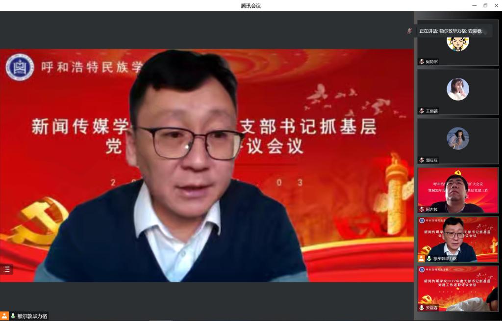 为进一步提升基层党建工作质量,发挥基层党组织的战斗堡垒作用,新闻传媒学院2022年度党支部书记述职评议会于1月9日通过腾讯视频会议顺利召开。校党委委员、组织部部长吴阿古拉参会指导。学院党总支书记额尔敦毕力格主持。