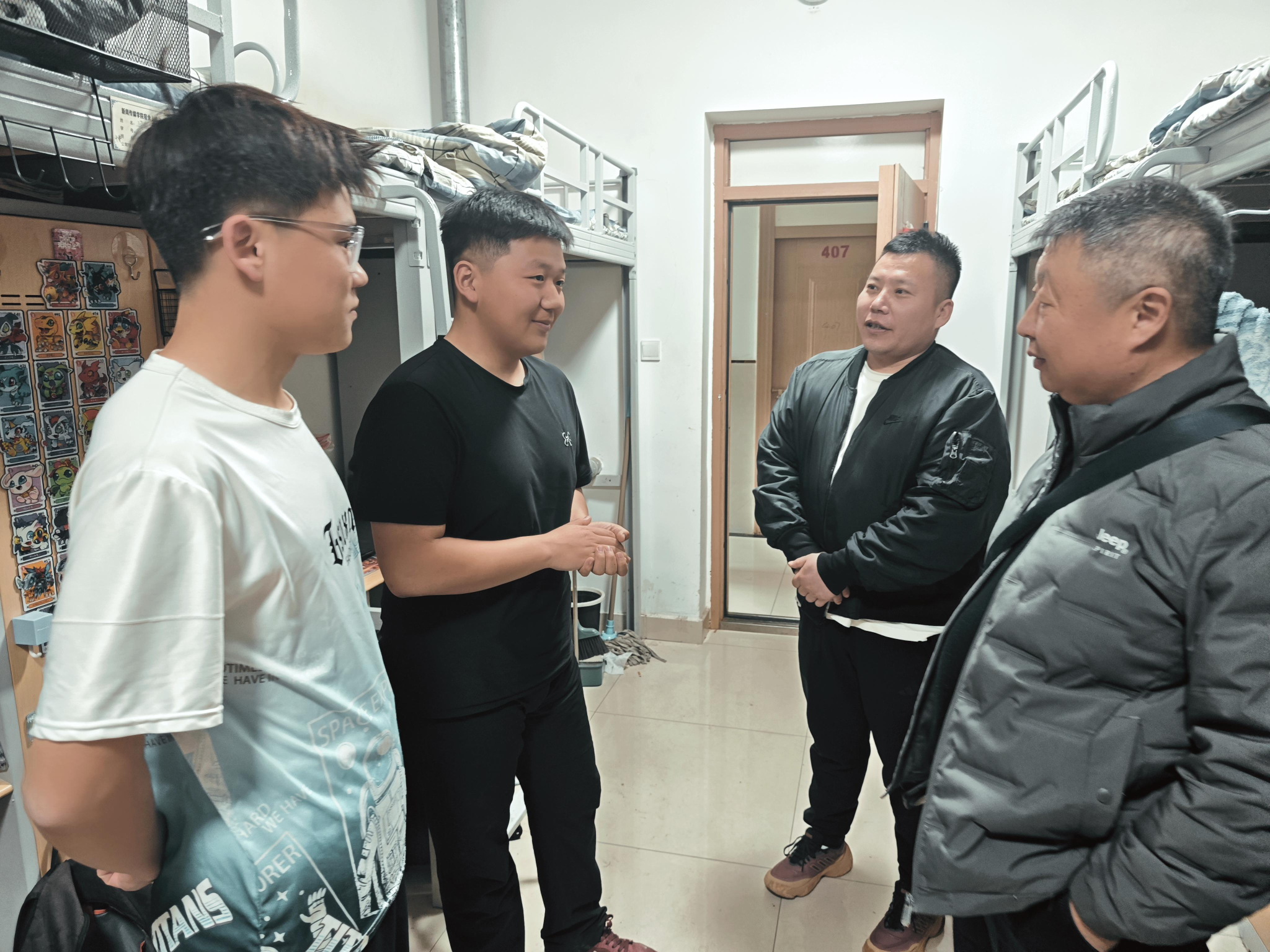 学院教师一行依次走进各宿舍楼,实地查看宿舍环境卫生、内务整理、水电设施、消防安全等情况,与同学们亲切交谈、细致交流。领导们详细询问大家的学习进度、生活适应、饮食起居、假期规划等情况,认真倾听同学们在住宿、餐饮、设施保障等方面的意见与诉求,对大家提出的问题现场记录、现场回应。