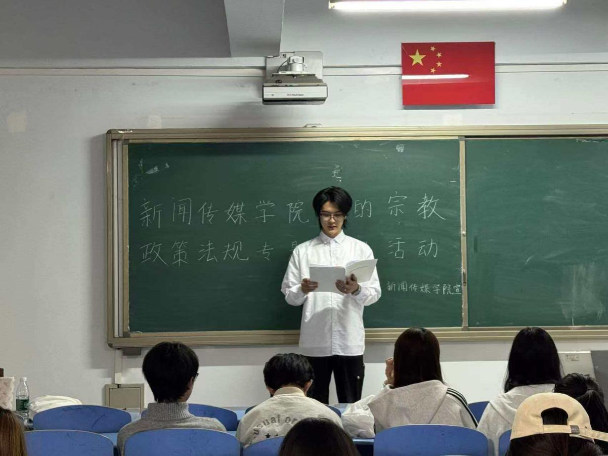 为深入响应国家关于宗教工作的决策部署,全面贯彻党的宗教工作基本方针,切实筑牢校园思想防线,2026年4月7日,新闻传媒学院在都林楼502教室组织开展党的宗教政策法规专题宣讲学习活动,学院60余名学生参加本次学习。