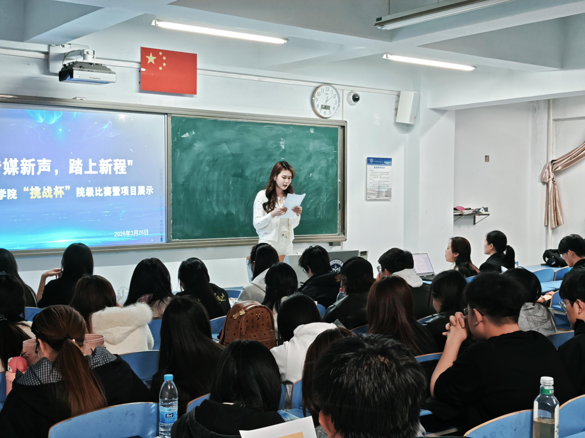 为引导和激励大学生广泛参与社会实践、社会观察,进一步提升米乐官网学生的创新意识、实践能力与专业素养,2026年3月26日,新闻传媒学院在都林楼502教室组织开展“传媒新声,踏上新程”挑战杯院级比赛暨项目展示活动。新闻传媒学院党总支书记王丽老师、团总支副书记裴婷婷老师,学院150余名学生参加。