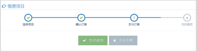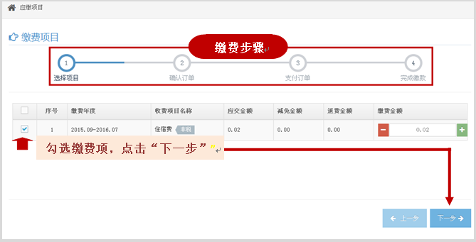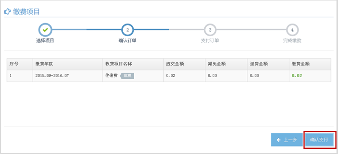 第3步: 点击“立即缴费”(见图二),打开该学生需要交纳的费用明细,包括交费区间、交费项目及交费金额。按照要求的交费金额选择交费项目,然后点击“下一步”(见图三)-确认缴费信息无误后点击“确认支付”(见图四)。