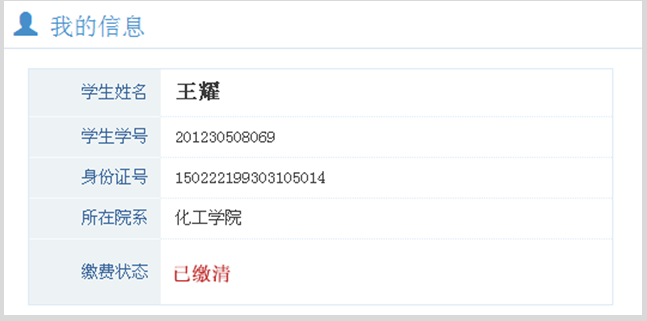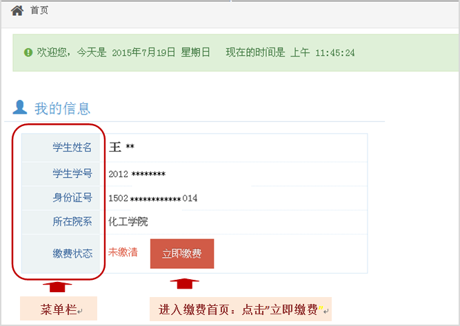 第2步: 在登陆窗口相应位置正确输入学号、姓名与验证码后点击“登陆”,登陆成功后可看到该学生基本信息(姓名、班级等)以及缴/欠费信息。(见图一)