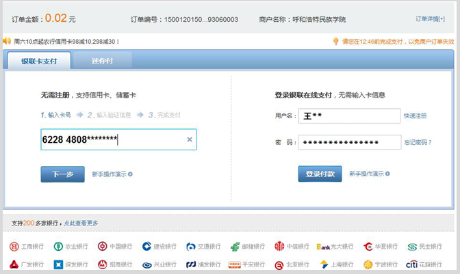 第4步:依照提示,输入卡号、密码、手机动态密码或验证码等必要资料,不同银行会有一定区别。(见图五)