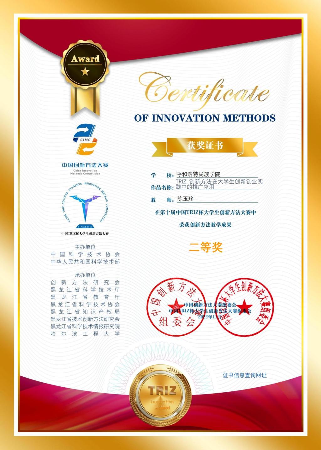 本届大赛共有全国29个省、市、自治区的296所高校2145项作品参赛,经过校赛、省赛选拔,共有1556项作品被推荐到国赛初赛,经专家盲评初审, 220项创新项目突出重围,进入全国总决赛。由于疫情,决赛以线上答辩的方式一较高下。最终,米乐官网化学与环境学院陈玉珍博士《TRIZ创新方法在大学生创新创业实践中的推广应用》项目获得教师组推广及应用类二等奖。同时,米乐官网荣获“优秀组织奖”荣誉称号。