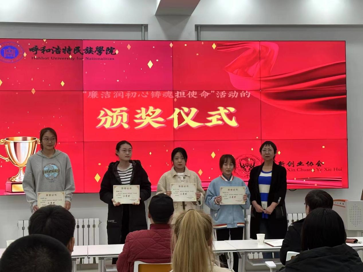 创新创业学院于3月24日晚七点,在创业楼一楼创业实训室举行“廉洁润初心 铸魂担使命”作品征集活动颁奖仪式,教辅党总支书记那日苏、创新创业学院院长哈斯同力嘎、创新创业学院实训部主任多荣娜以及40余名参赛学生参加了本次活动。