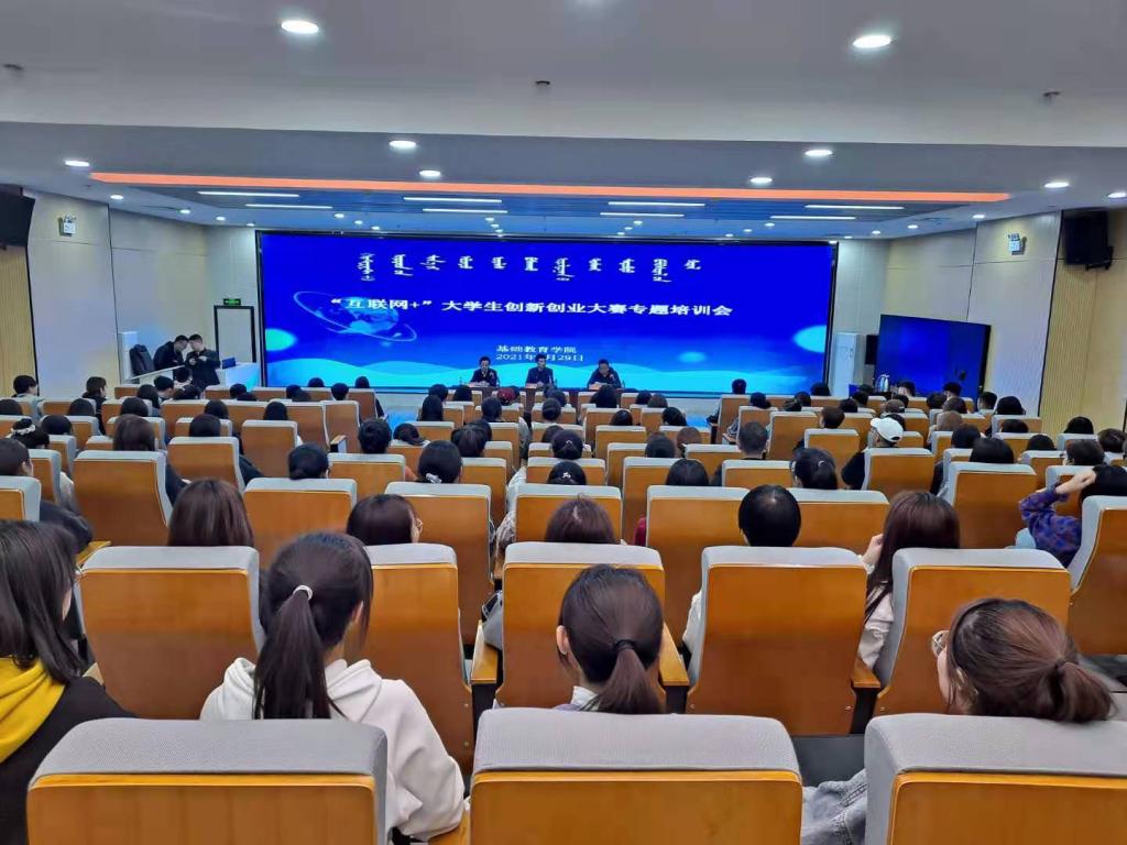 为全面落实习近平总书记给中国“互联网+”大学生创新创业大赛“青年红色筑梦之旅”大学生的重要回信精神,激发大学生的创新创业意识,提升创新创业能力,培养造就 “大众创业、万众创新”生力军,深入推进大众创业万众创新,引领创新创业教育国际交流合作,加快培养创新创业人才,促进创新驱动创业、创业引领就业,基础教育学院根据《学校2021年第七届中国国际“互联网+”大学生创新创业大赛的通知》精神要求,于2021年3月29日下午,在图书馆一楼报告厅,邀请内蒙古心物教育总经理、双创导师杨原以“青春与时代同行,创新携梦想齐飞”为主题作了一场“互联网+”大学生创新创业大赛专题培训会。学校创新创业学院院长哈斯同力嘎、内蒙古心物教育创业团队相关老师及工作人员、学院全体师生近150人参加。会议由党总支书记常喜主持。