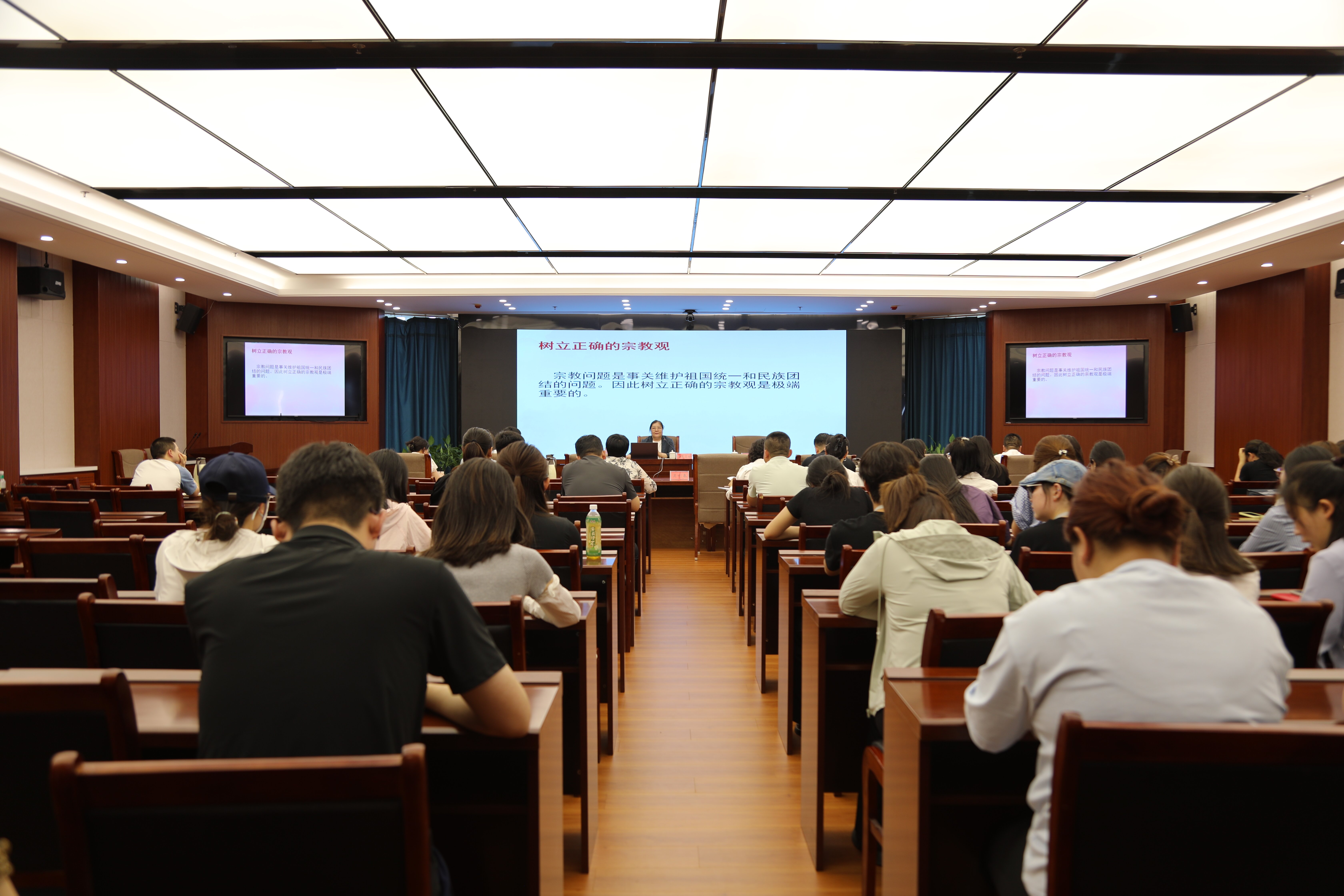 斯琴高娃教授作了题为《马克思主义宗教观与党的宗教政策》的报告,从理论维度系统阐释了宗教的本质特征、产生根源、社会功能及消亡条件,深入解读了工人阶级政党对待宗教的基本原则。报告紧密结合高校工作实际,重点分析了新时代宗教工作的基本方针、宗教信仰自由政策的实践要求,为做好高校宗教工作提供了系统的理论指导和实践路径。与会人员纷纷表示,通过专题学习,进一步深化了对宗教工作政治性、特殊性的认识,提升了做好校园宗教工作的能力水平。