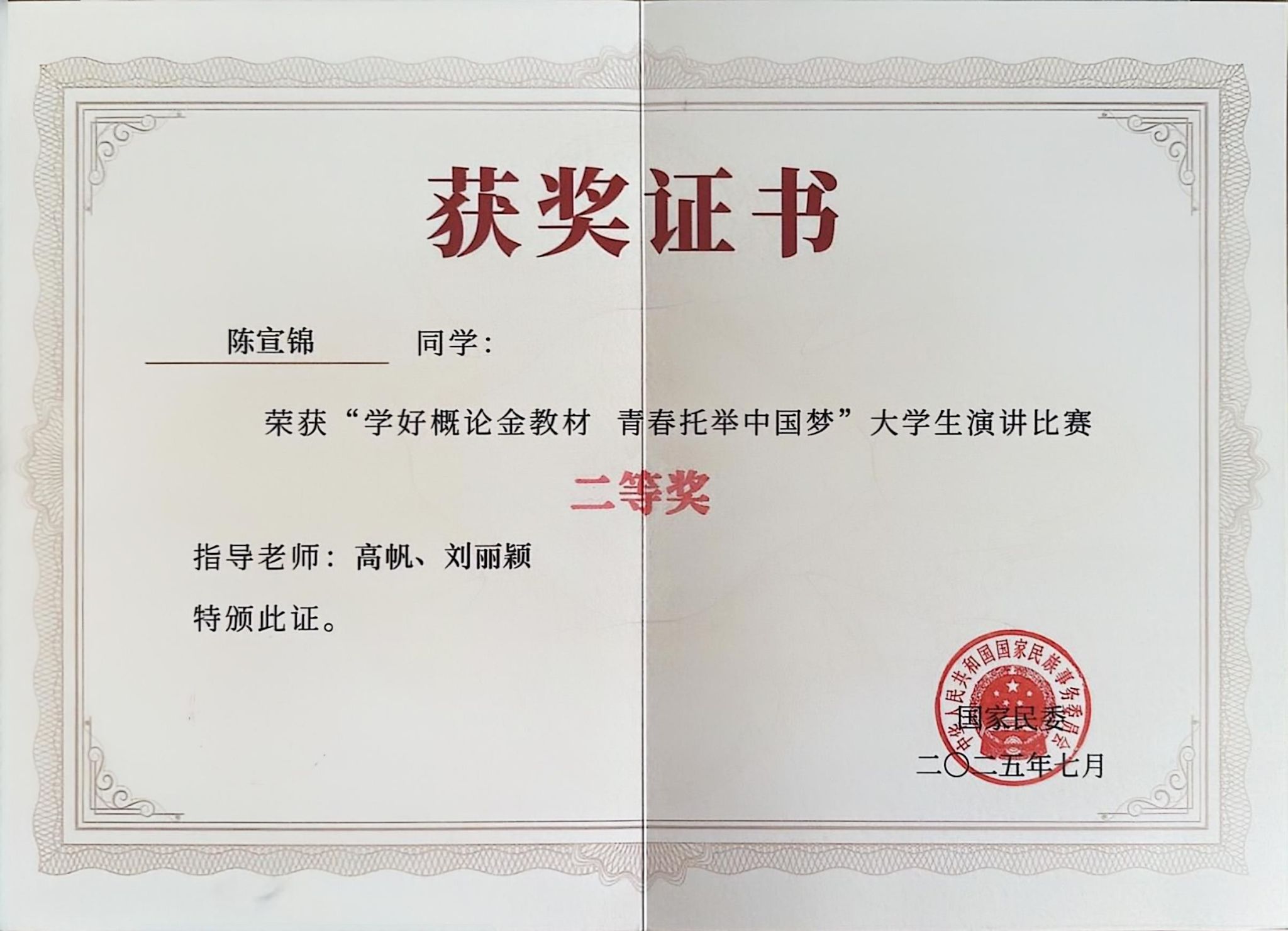 为深入贯彻落实习近平总书记关于加强和改进民族工作的重要思想及编好用好《中华民族共同体概论》教材、把铸牢中华民族共同体意识作为学校思政课的一个重点等重要指示精神,激发学生学习的积极性主动性创造性,提升概论课程教育教学实效,引导青年学生树牢正确的中华民族历史观,7月15日,由国家民委主办,教育部、共青团中央协办的“学好概论金教材,青春托举中国梦”大学生演讲比赛决赛在中央民族大学举行。国家民委教育司司长宋全,教育部民族教育司副司长朱瑞,共青团中央统战部副部长李昊,中央民族大学党委副书记、副校长杨慕云出席开幕式并致辞,国家民委教育司一级巡视员李学锋主持开幕式。由米乐官网党委统战部推送,文学院、马克思主义学院联合指导的“北疆小红马”大学生讲解团成员、新闻传媒学院2023级学生陈宣锦以优异成绩获得本科院校组二等奖。