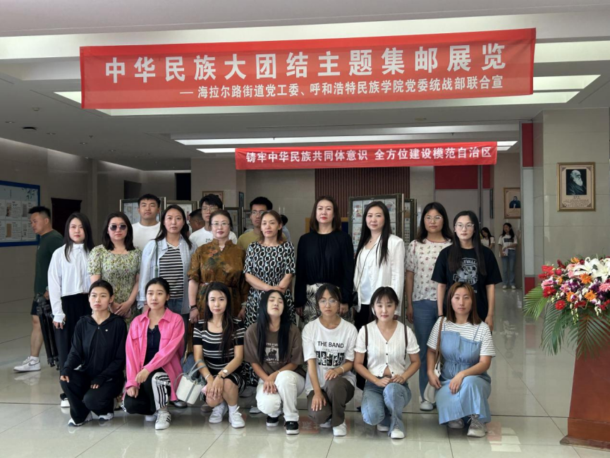 为迎接建党102周年,推动学习贯彻习近平新时代中国特色社会主义思想主题教育走深走实,有形有感有效铸牢中华民族共同体意识,学校党委统战部联合海拉尔路街道党工委、内蒙古邮政分公司集邮文化传媒部、内蒙古老干部活动中心党总支、内蒙古老干部中心集邮协会,在北区图书馆二楼举办“中华民族大团结”主题集邮展览。国务院参事室特约研究员,曾任中纪委驻交通运输部纪检组组长、原自治区党委副书记、中华全国集邮联合会第七届理事会会长杨利民亲临现场。学校党委书记刘九万,党委副书记、校长韩伟新,党委委员、统战部部长包君,党委委员、党政办公室主任朝格吉乐图到场观展。学校各二级学院、各处级部门均组织师生参观了展览。