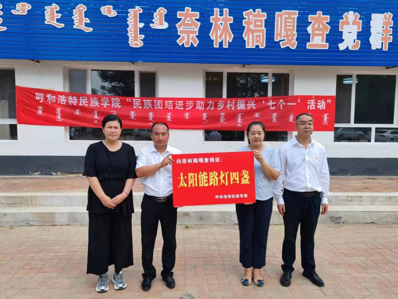 本次活动立足抓手有形、受众有感、教育有效,精心设计活动内容,即开展一次党的民族工作和宗教政策宣传、开展一次眼科义诊、开展一次推广普及国家通用语言文字活动、美化一处乡村、捐赠一批物资、开展一次铸牢中华民族共同体意识教育、开展一次法律法规咨询等。活动中,结合学校铸牢中华民族共同体意识教育馆展陈内容,向群众介绍民族交融汇聚的中华民族共同体的起源、形成和发展脉络,宣传了《内蒙古自治区民族团结进步条例》《中华人民共和国国家通用语言文字法》《内蒙古自治区实施<中华人民共和国国家通用语言文字法>办法》《铸牢中华民族共同体意识学习手册》《反邪教警示教育进乡村》等内容。为了解决当地嘎查的实际需要,学校一行为当地捐赠太阳能路灯4盏和法律条例、理论图书80余册,并由专业医护人员对村民进行了眼科疾病筛查和视力测试,进一步营造民族团结一家亲、同心共筑中国梦的和谐氛围。