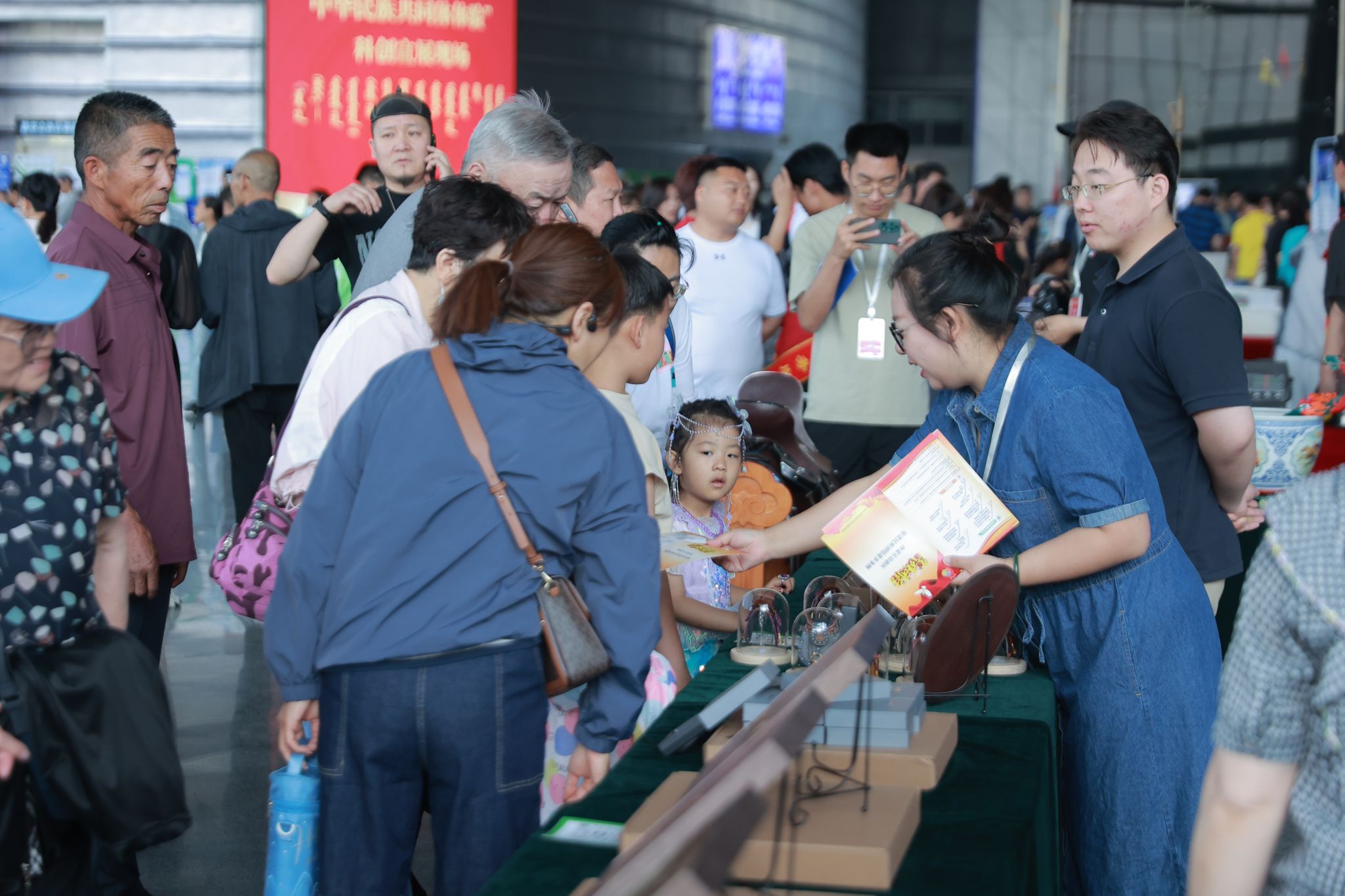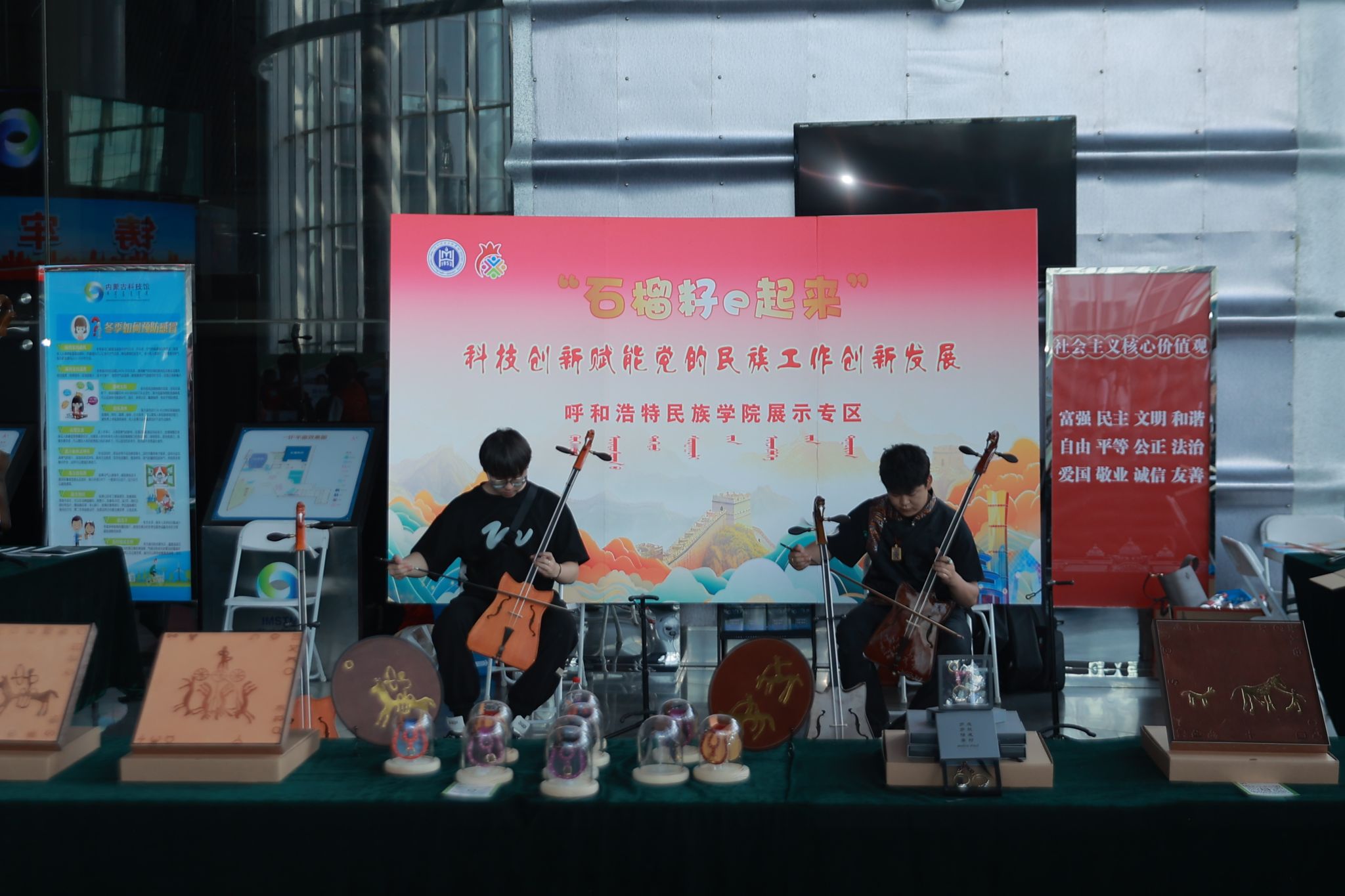 学校展陈专区展出了美术学院党外知识分子、留学归国人员、非遗传承人制作的毡画、皮画、金银措工艺品等作品,以及音乐学院师生在中国国际大学生创新大赛(2023)中的金奖项目——“马背神韵”马头琴作品。活动现场发放了《关于全面贯彻铸牢中华民族共同体意识主线的若干措施》《内蒙古自治区促进民族团结进步条例》等宣传手册。一曲曲悠扬的马头琴声,一件件精美的艺术展品,吸引了众多游客和家长、孩子细细参观体验交流。