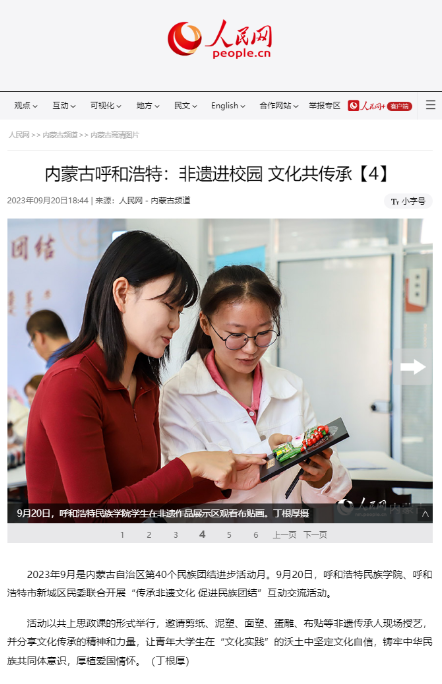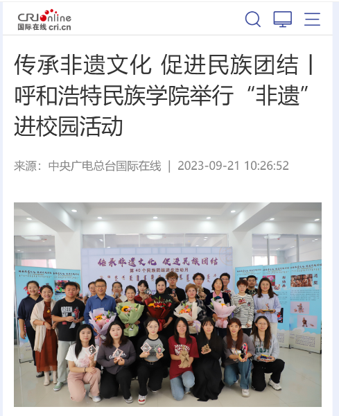 在第40个民族团结进步活动月,学校开展了系列活动,其中9月20日举办的“传承非遗文化 促进民族团结”非遗文化进校园活动,因内容丰富、形式新颖、特色鲜明,经学校积极与媒体联系,持续受到社会各界的广泛关注和大力宣传。其中,新华网客户端的报道刊发3小时,即达到15万人次的点击量。