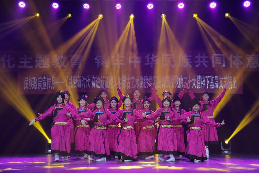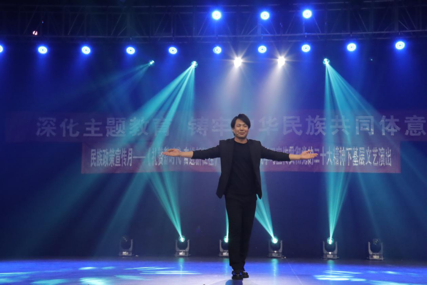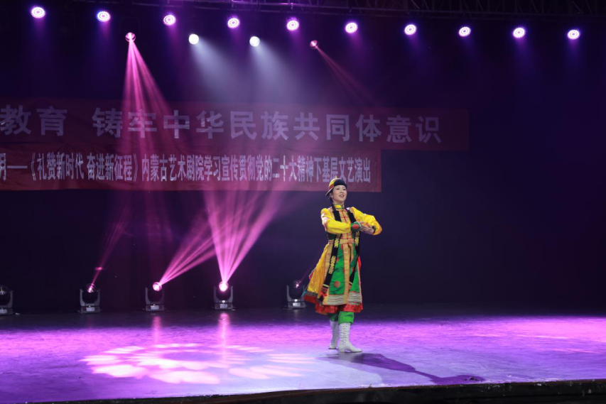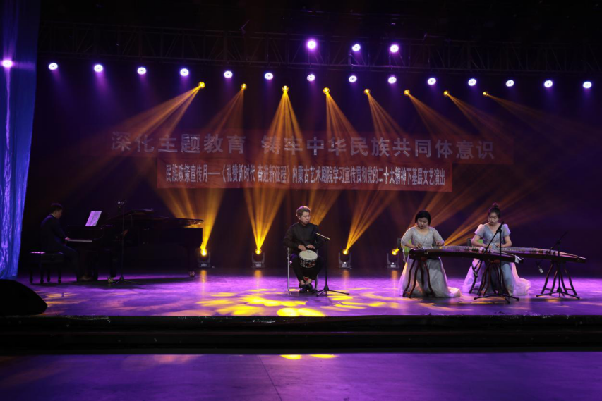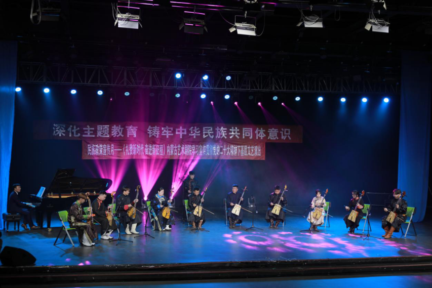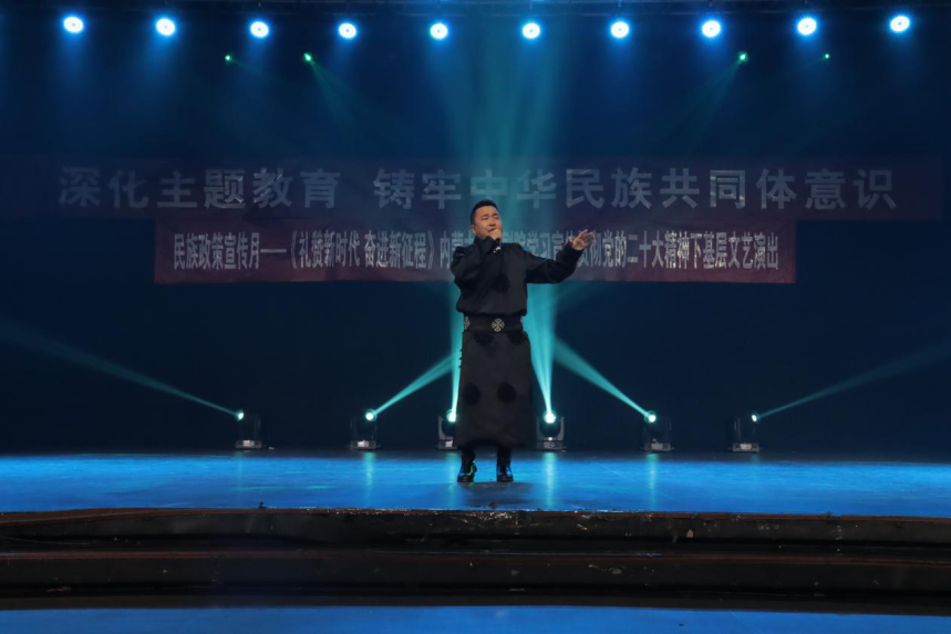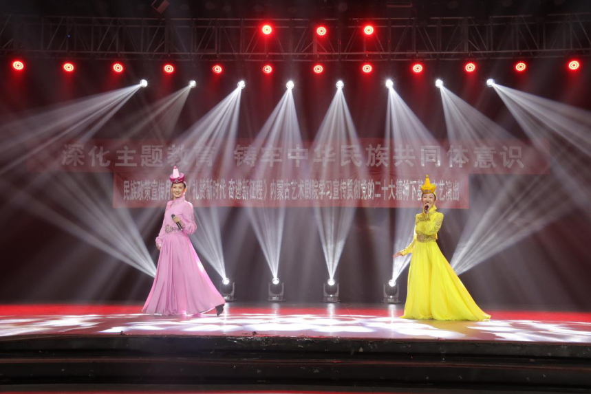 为深入学习贯彻习近平总书记关于加强和改进民族工作的重要思想和党的二十大精神,深化学习贯彻习近平新时代中国特色社会主义思想主题教育,扎实做好以铸牢中华民族共同体意识为主线的民族团结进步创建工作,丰富“民族政策宣传月”活动内容,5月26日下午,米乐官网与内蒙古艺术剧院在学校演播厅联合举办了“深化主题教育 铸牢中华民族共同体意识”文艺演出。自治区党委主题教育第十一巡回指导组副组长李文元,联络员张琪娟、成员刘钰出席活动。学校党委书记刘九万,党委副书记、校长韩伟新,党委委员、纪委书记、监察专员王冬梅,党委委员、副校长高喜天,党委委员、副校长刘瑞鸿和党政部门负责人、各二级学院书记、院长以及音乐学院、公共管理学院师生代表参加了本次活动。