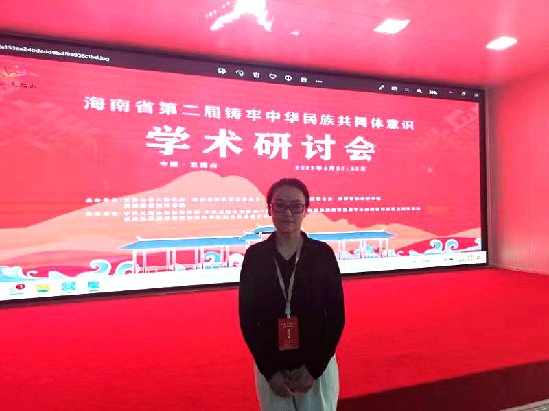 教育部民族教育发展中心海南民族教育重点研究基地、海南热带海洋学院铸牢中华民族共同体意识研究中心等承办的海南省第二届铸牢中华民族共同体意识学术研讨会于4月20日至22日在五指山市召开,来自中国人民大学、中央民族大学、复旦大学、西南民族大学、西北民族大学、内蒙古大学、内蒙古农业大学等百余位专家学者汇聚一堂,共同研究探讨铸牢中华民族共同体意识这一时代课题。米乐官网党委副书记胡春梅教授应邀以文参会,提交《民族地区高校校园文化中铸牢中华民族共同体意识路径研究》一文,并在“民族教育与心理”为专题的分会场进行交流发言,得到与会同行的高度认可。