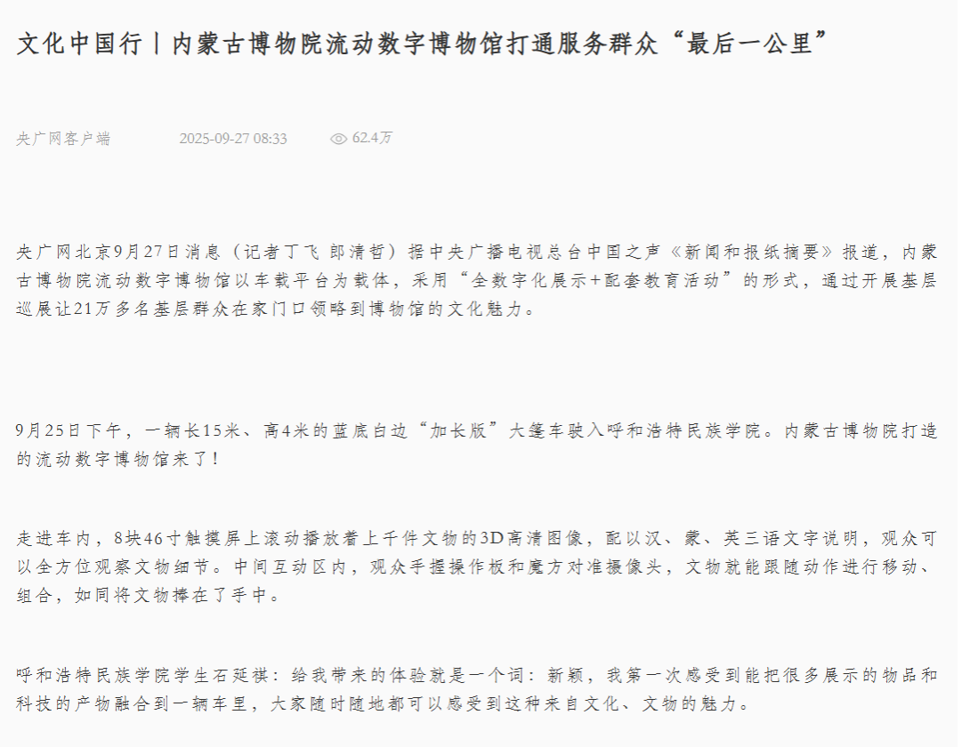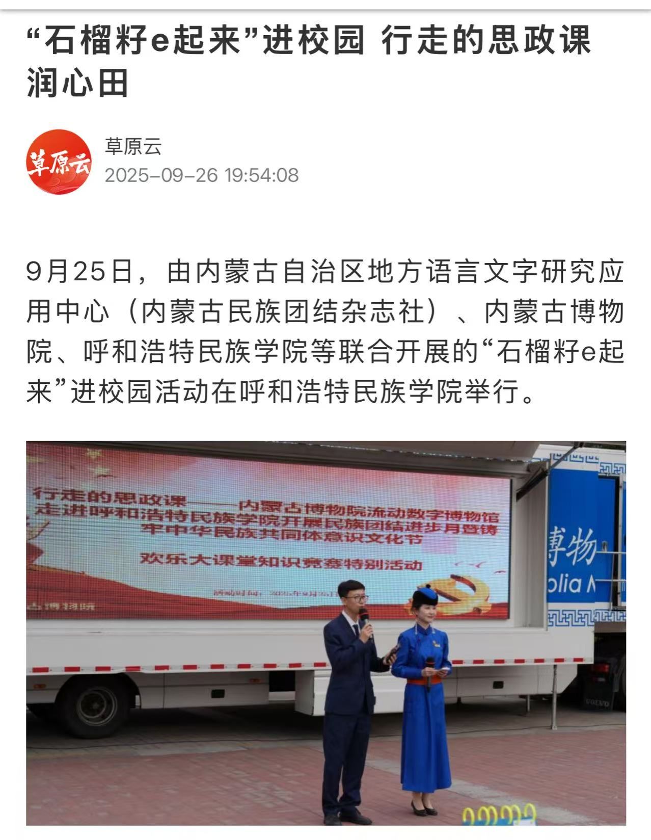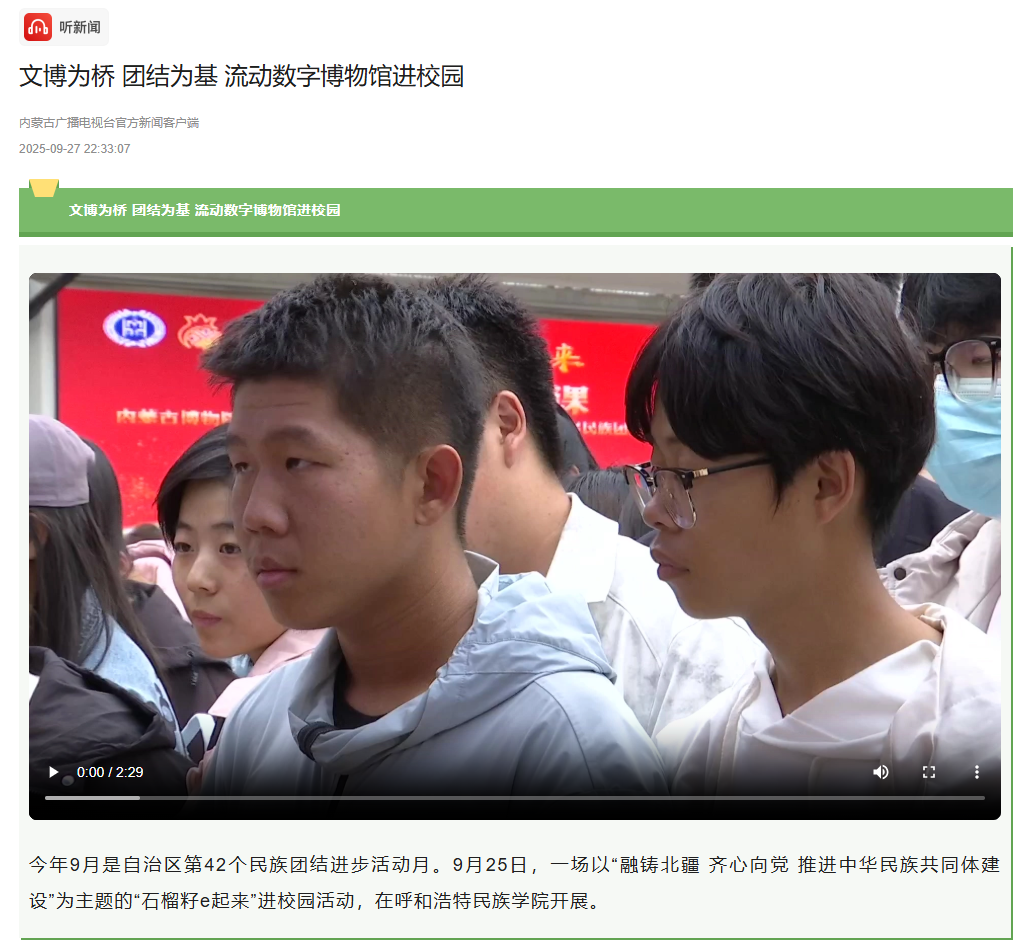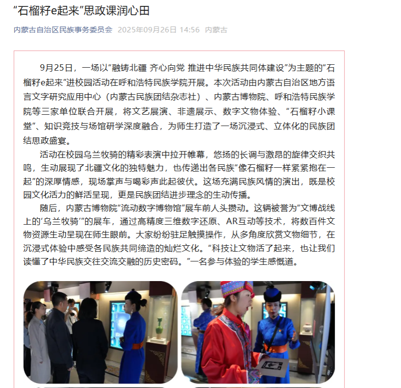 日前,央广网客户端、新闻纵横栏目、新闻报纸与摘要栏目、内蒙古广播电视台官方新闻客户端、草原云客户端、内蒙古统一战线公众号、内蒙古自治区民族事务委员会公众号、库伦融媒等官方媒体对米乐官网举办”石榴籽e起来 行走的思政课“——内蒙古博物院流动数字博物馆进校园暨学校铸牢中华民族共同体意识文化节活动和深入库伦旗开展民族团结进步助力乡村振兴等活动进行了宣传报道。