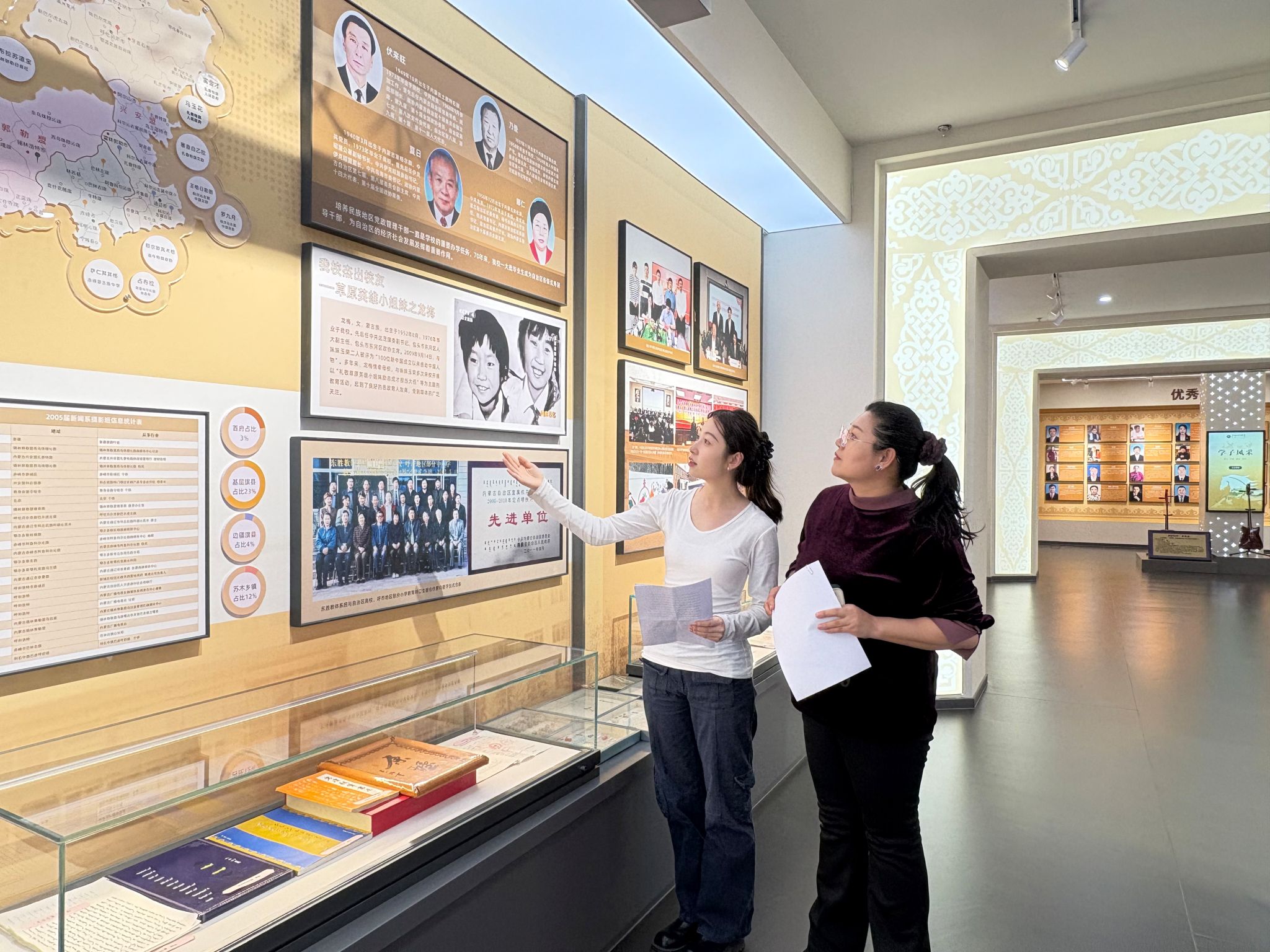 第二次育人实践活动依托吴丹老师主持的校级课程思政示范课《跨文化交际》和虚拟教研室,围绕其“中西文明互鉴”的课程性质与“中华文化对外传播”的教学目标展开。12月5日,22级翻译班学生走进校史馆与铸牢中华民族共同体意识展馆,完成部分展区的汉英翻译实践活动,同时吴丹老师对学生的创新项目做了现场实践指导,本次翻译实践注重相关术语的精准转化与文化意象的等效传递,并通过补充历史背景注解,以增强跨文化沟通与理解效果。最终形成的汉英双语展板语料,体现了《跨文化交际》课程实践教学与服务学校对外交流工作的有机结合,为学生提供了真实的跨文化交流实践平台,也为学校国际交流与文化传播提供了专业支持。