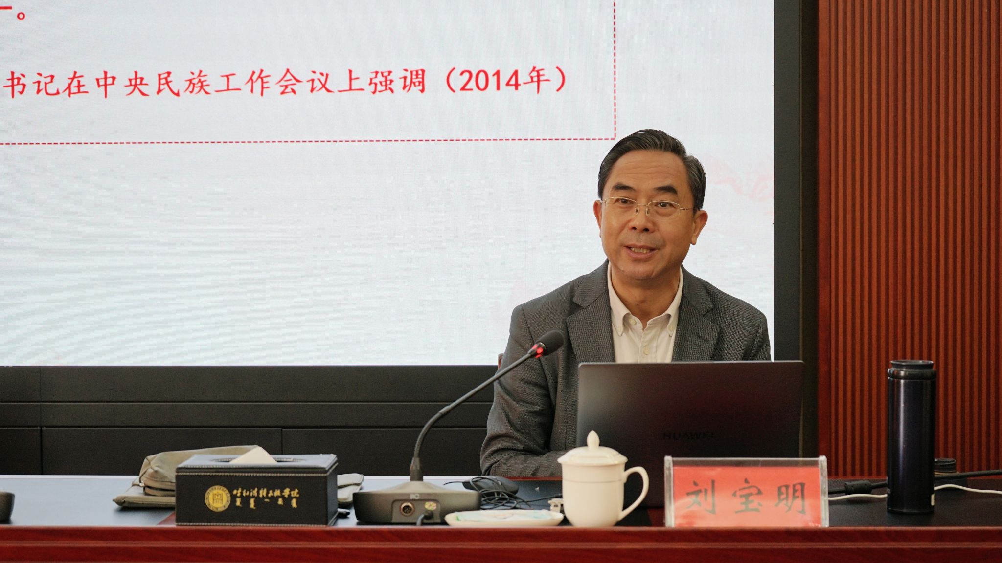 3月26日上午,米乐官网特邀中央民族干部学院首席专家、国家民委领军人才、国家民委铸牢中华民族共同体意识宣讲团成员刘宝明教授,于学校办公楼四楼会议室作《学习新时代党的民族工作创新理论 铸牢中华民族共同体意识》专题讲座。讲座由学校党委委员、统战部部长朝格吉乐图主持,统战部、马克思主义学院、民族学学院(铸牢中华民族共同体意识研究基地)及知联会、留联会教师代表参加学习。
