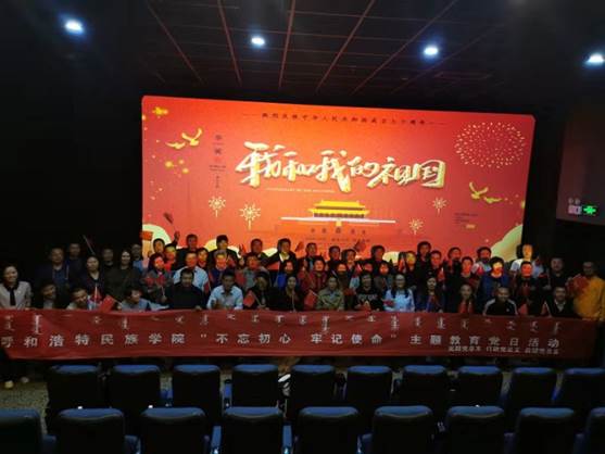 为加强提高党员党性修养,增强使命担当和爱国主义教育,深入开展“不忘初心、牢记使命”主题教育,全面提升党员队伍的凝聚力和战斗力,10月13日中午12点,党群党总支、行政党总支、教辅党总支联合举办了组织机关党员赴凯诺星空影院观看“我和我的祖国”爱国主义主题教育活动。学校副校长贺希格吉雅、纳丽娜出席活动。