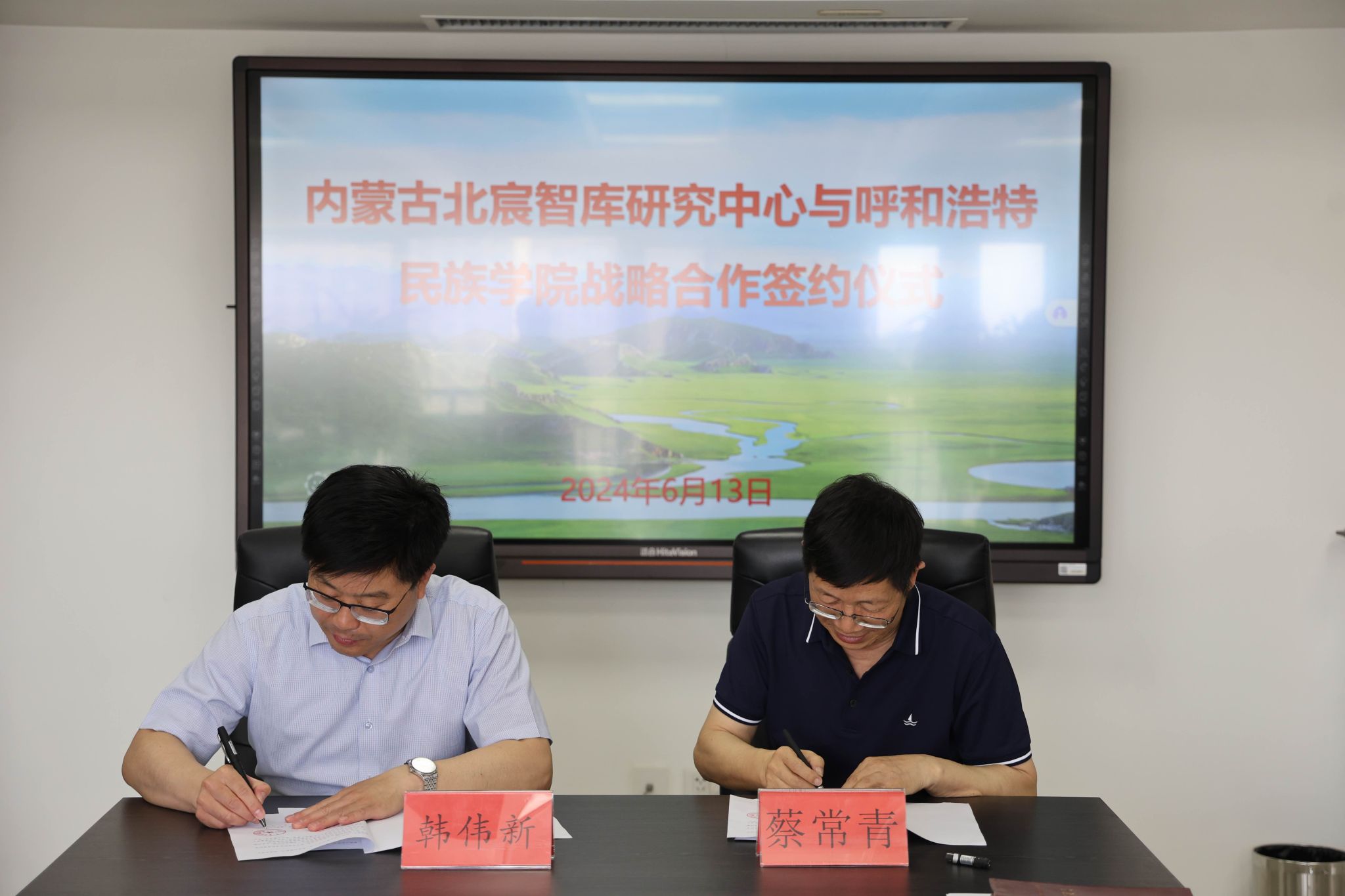 6月13日,校党委副书记、校长韩伟新带队赴内蒙古北宸智库研究中心签署战略合作协议,并开展座谈交流。校党委委员、副校长高喜天出席签约仪式。内蒙古北宸智库研究中心理事长蔡常青、北宸智库决策咨询专委会主任包思勤、北宸智库民族政策专委会主任毅松、北宸智库研究中心监事长马益波及北宸智库公共传播部吴志城出席签约仪式。