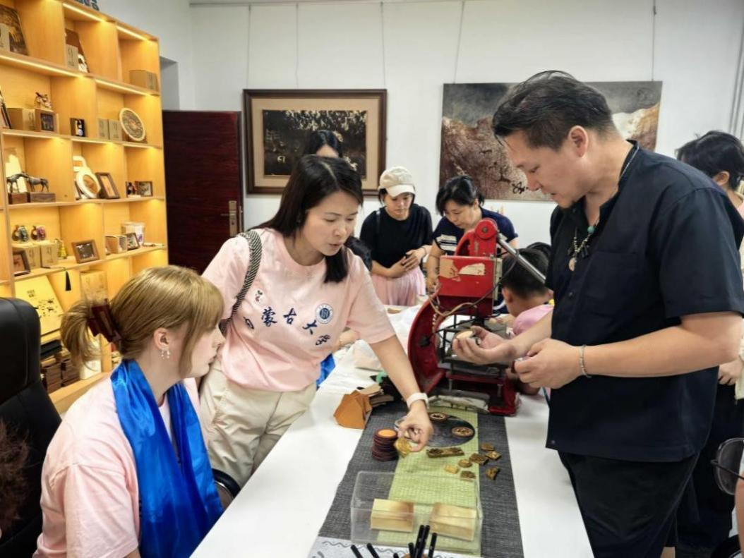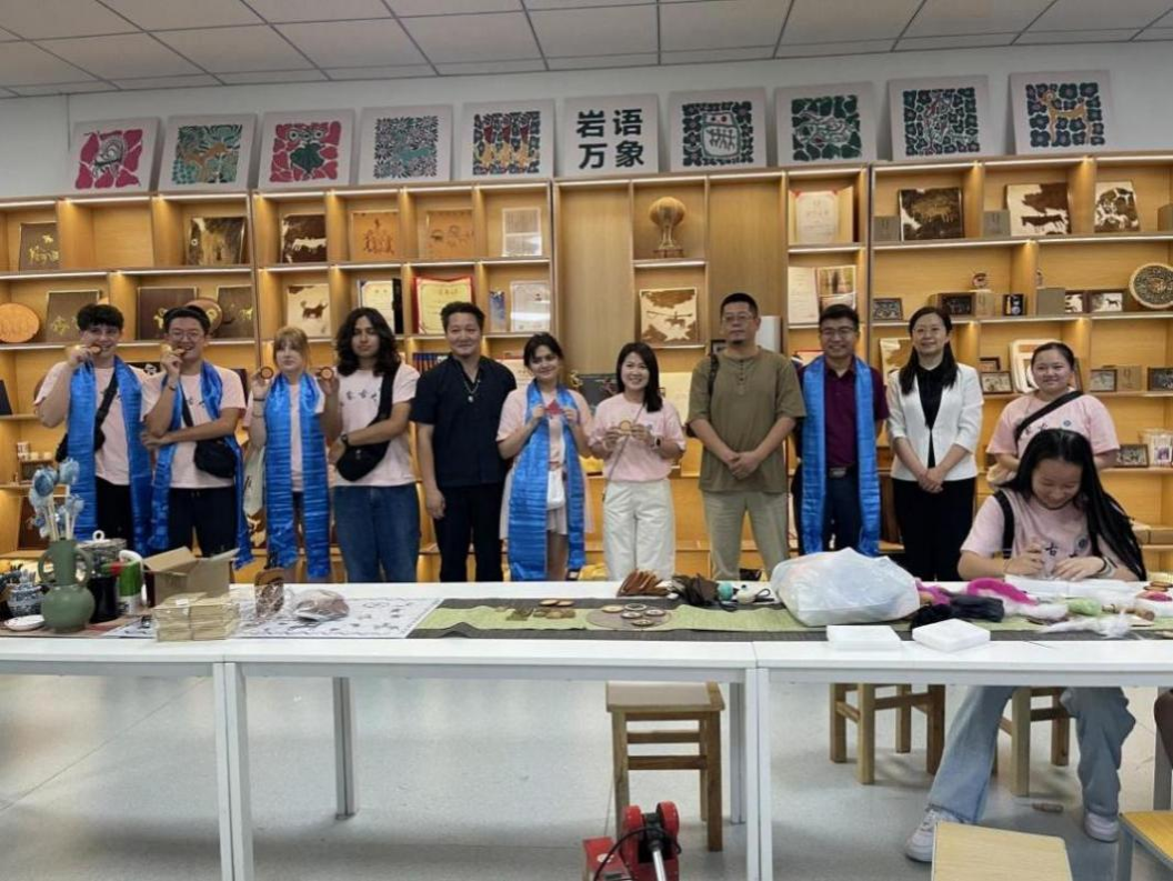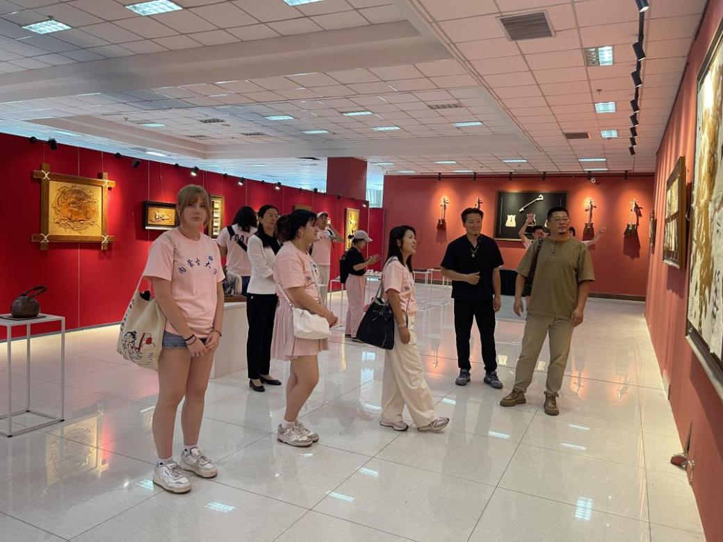 访问团师生在美术与设计学院参观了非遗美术作品展,走进自治区级创新工作室“木仁创新工作室”,学习体验了皮画、毛毡等非遗美术作品制作,感受到了北疆非遗技艺里的匠心与文化密码,在创作互动中实现了审美与情感的跨文化共鸣。