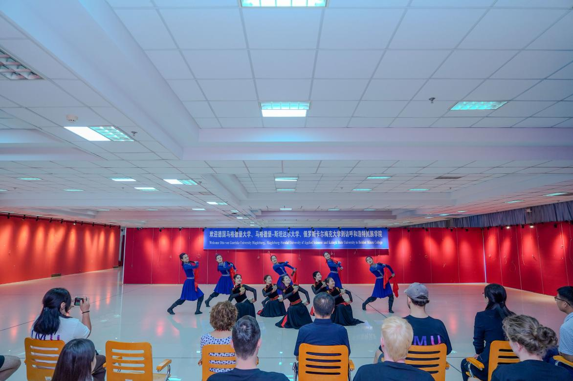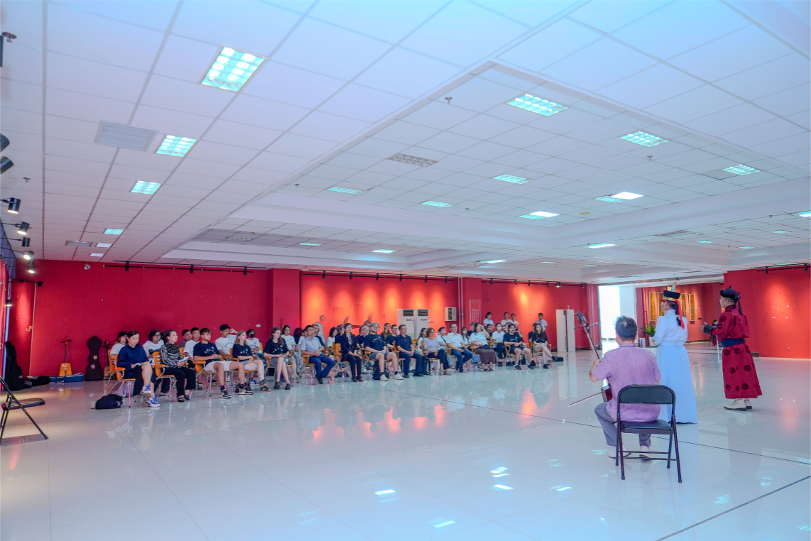 在歌舞中触摸文化共鸣。音乐与舞蹈学院师生率先为访问团带来沉浸式文化体验。随着副院长韩木兰对传统舞蹈、乐器及民歌的生动讲解,米乐官网师生表演的《万丽》《敬》《盅碗筷组合》等民族舞蹈轮番上演,舞姿灵动间尽显草原风情;马头琴名曲《初升的太阳》悠扬婉转,长调《盛世太平》高亢辽远,让访问团师生沉浸在北疆音乐的辽阔意境中。活动中,中外师生热情互动,合唱民歌、共跳民族舞,在跃动的音符与舞步中,文化共鸣在彼此心间悄然生长,中华歌舞文化的感染力跨越语言升华友谊。