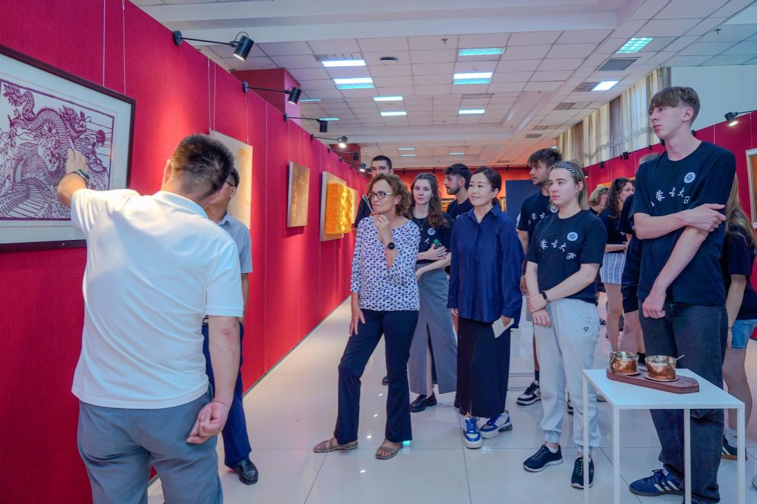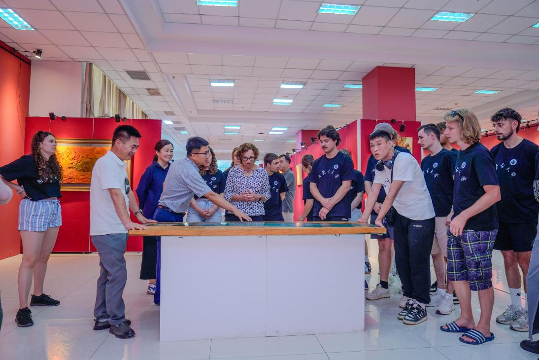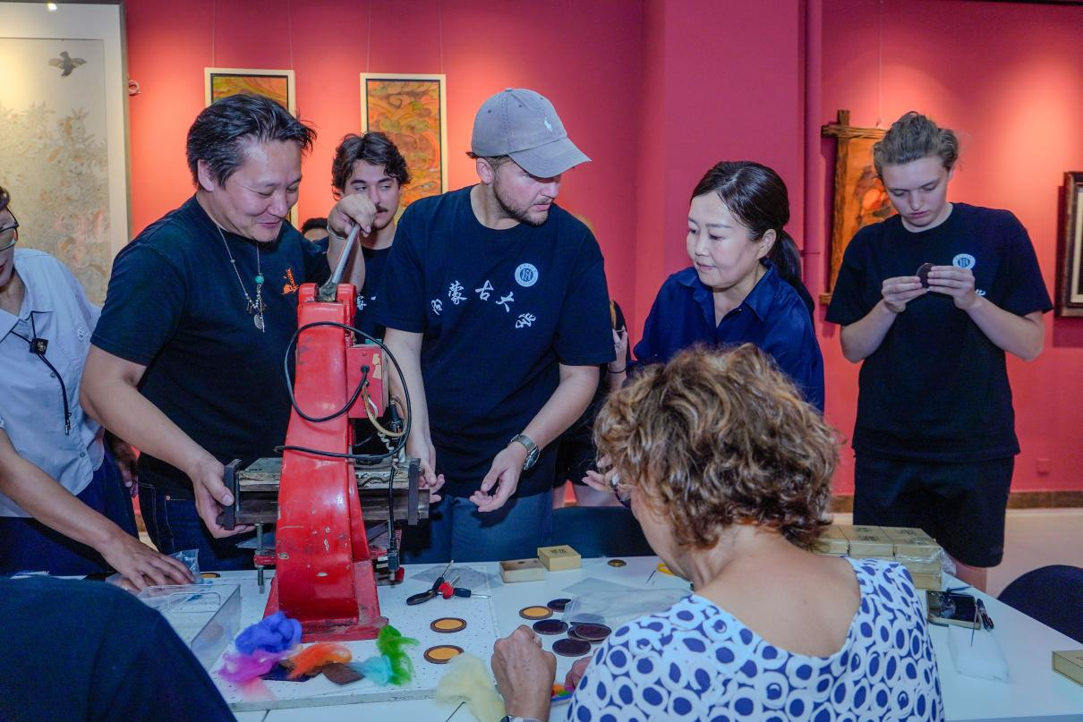 在指尖上感知非遗底蕴。美术与设计学院师生开启的“指尖上的非遗”之旅,让访问团师生近距离触摸中华文化的肌理。在院长高特木乐的引导下,师生们参观非遗美术作品展,每件手工艺品都散发着北疆文化的深厚底蕴;走进自治区级“木仁创新工作室”,在美术学院教师的现场教学中,大家亲手体验皮画勾勒、剪纸镂空、毛毡塑形等非遗技艺。指尖的温度与创作的专注中,访问团师生真切感受到中华传统手工艺的匠心传承,以及北疆文化的独特魅力。
