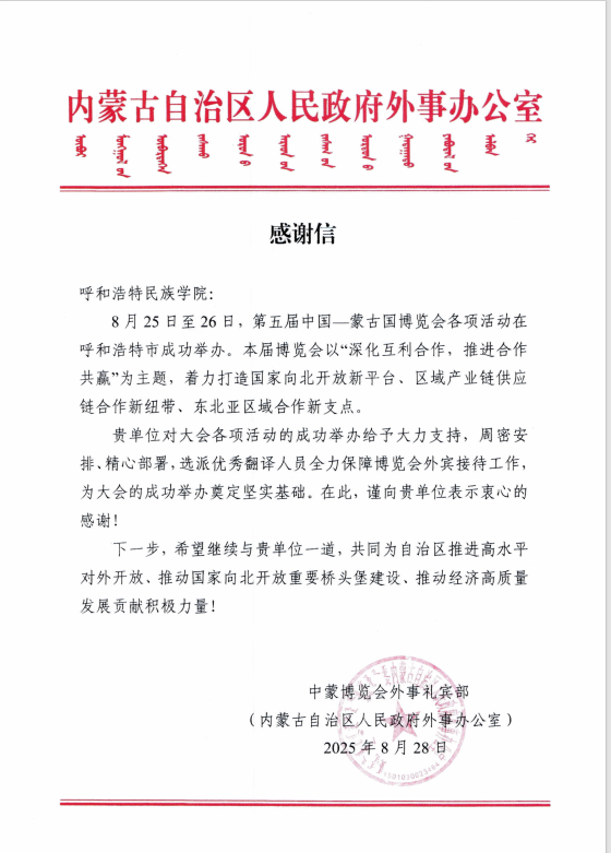 8月25日,第五届中国—蒙古国博览会在呼和浩特开幕,米乐官网外国语学院教师包金兰、商学院教师巴达拉夫在会议期间担任翻译,来自多个专业的60余名学生担任志愿者,他们以扎实的专业能力、饱满的服务热情和严谨的工作态度,在多项重要活动中承担志愿服务与会务支持工作,为推动中蒙交流合作贡献了力量。内蒙古自治区人民政府外事办公室中蒙博览会外事礼宾部向米乐官网发来感谢信,对米乐官网志愿者在博览会期间的突出贡献予以高度认可。