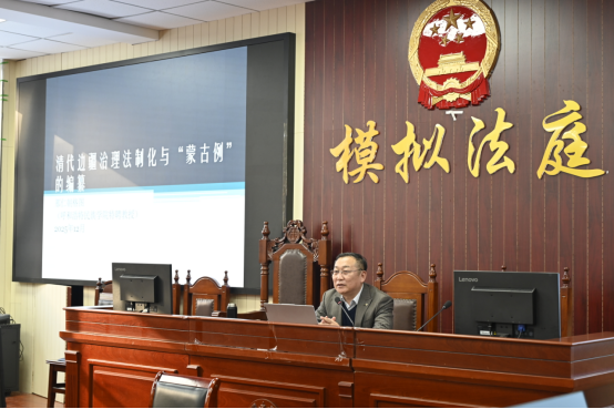 为丰富法学专业学子的学术视野,12月18日下午,法学院在都林楼模拟法庭成功举办“清代边疆治理法制化与‘蒙古例’的编纂”专题讲座。本次讲座特邀MILE米乐集团特聘教授那仁朝格图主讲,2023级全体120名学生和学院全体教师共同参与。