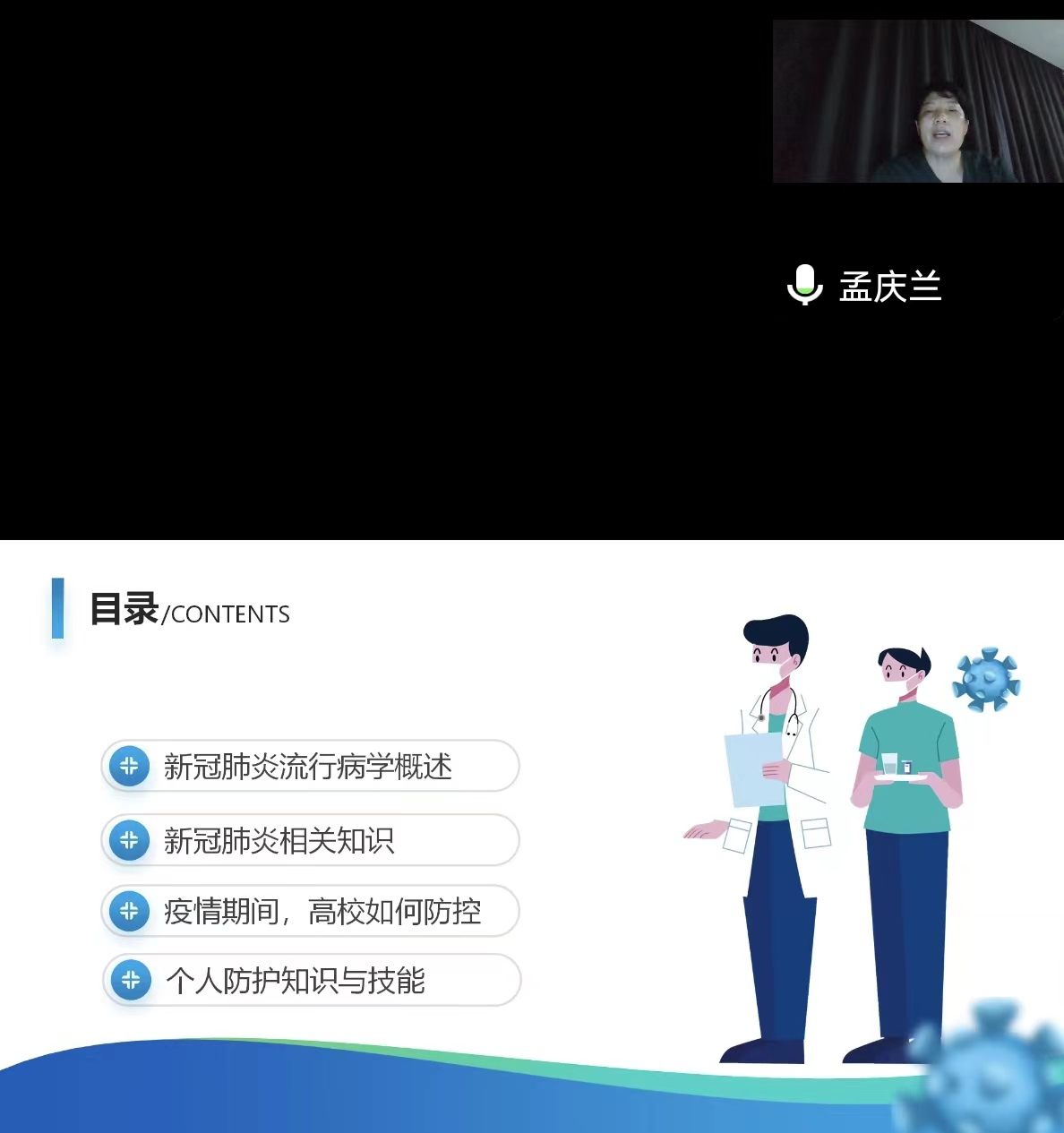 为进一步加强校园疫情防控工作,不断加强校园卫生安全管理,提高师生应对新冠疫情的能力和水平,如何做好疫情防控和自我防护,10月23日晚,校工会举办了“高校新型冠状病毒肺炎感染防控”线上专题培训,学校全体教职工、物业、安保、食堂、商铺及相关人员通过线上观看学习,讲座由工会主席邢文岐主持。