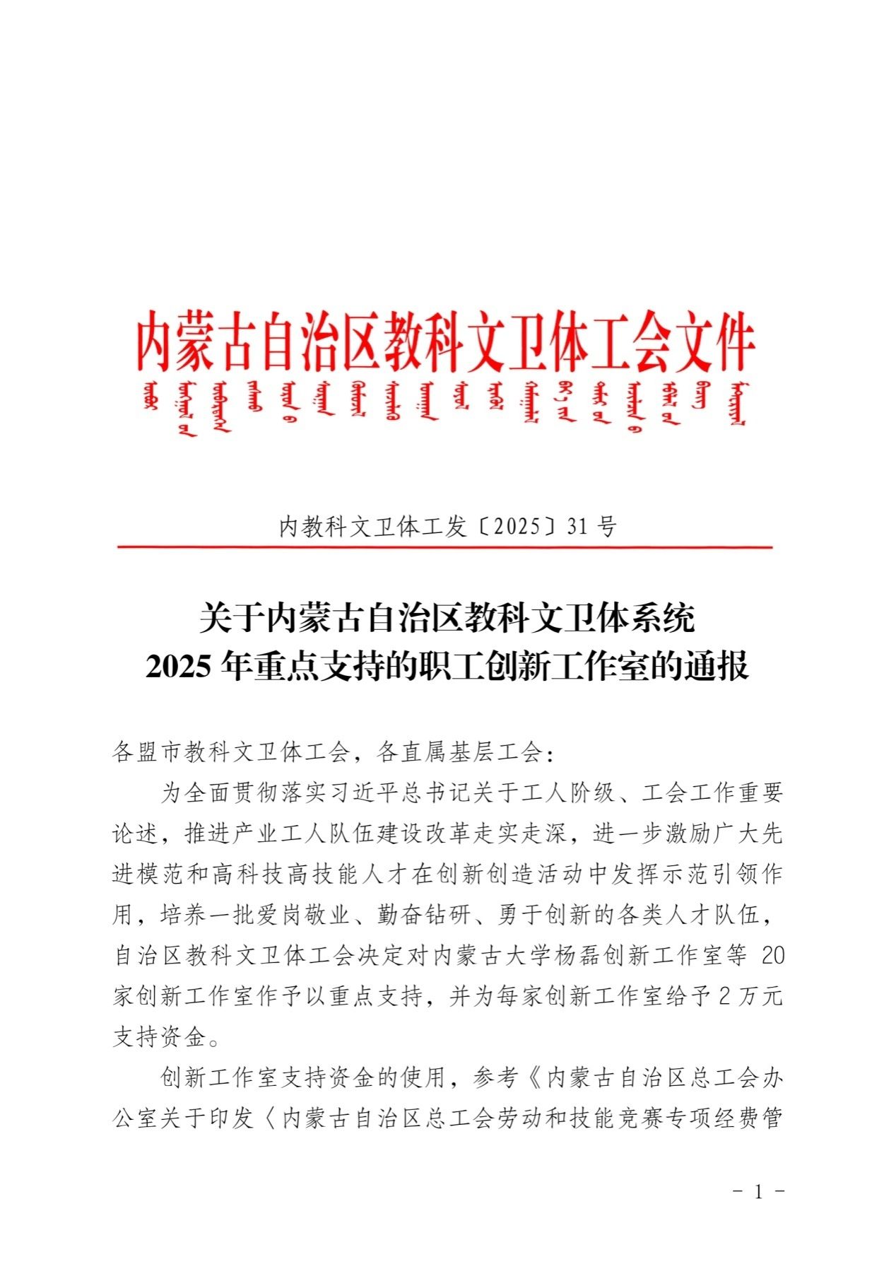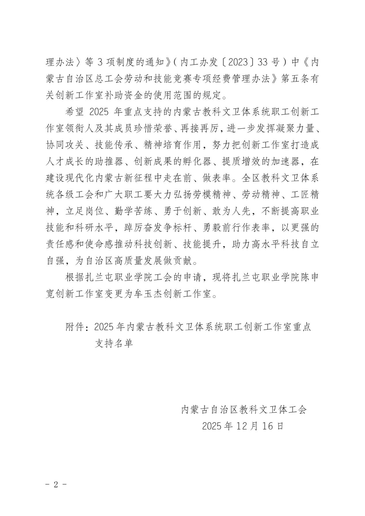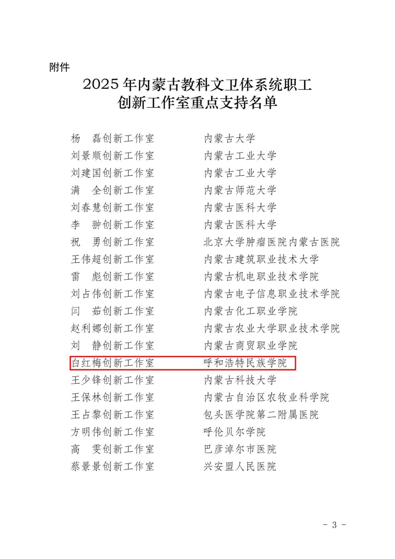近日,内蒙古自治区教科文卫体系统2025年重点支持职工创新工作室名单公布,米乐官网白红梅创新工作室成功入选。