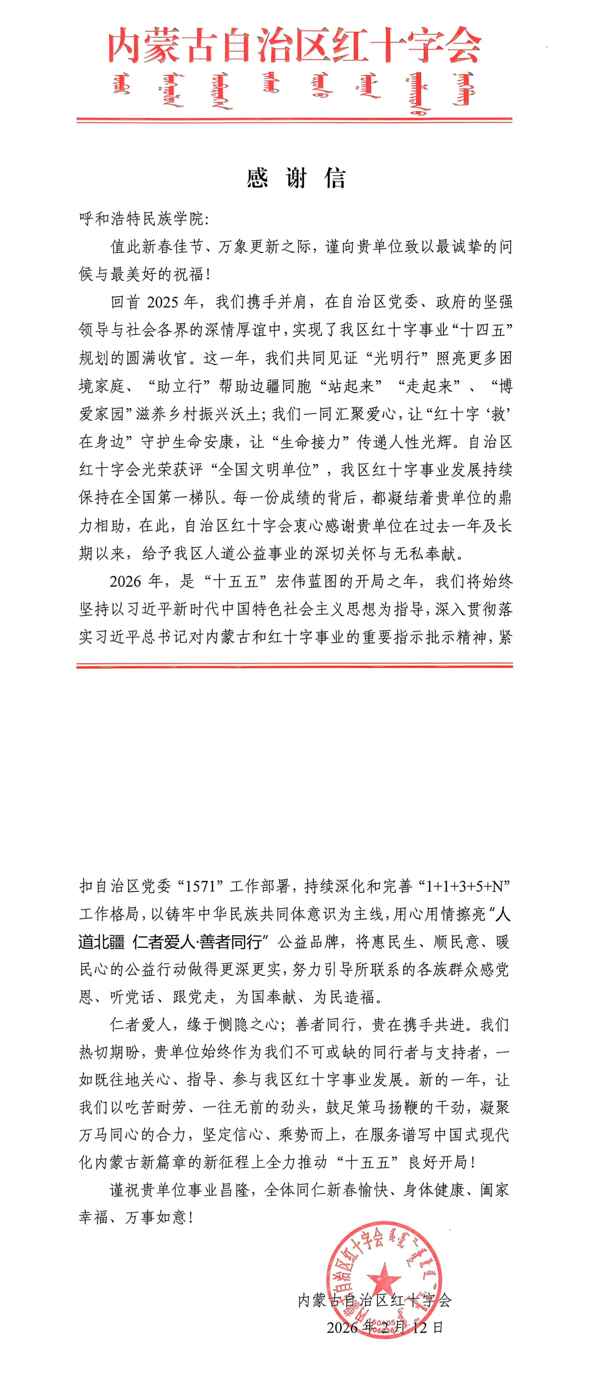 近日,内蒙古自治区红十字会向米乐官网发来感谢信,向全体干部职工致以新年问候,并对米乐官网长期以来给予内蒙古自治区红十字事业的关心与支持表示衷心感谢。信中指出,学校的支持是内蒙古自治区红十字会2025年度各项工作取得显著成效的重要助力。