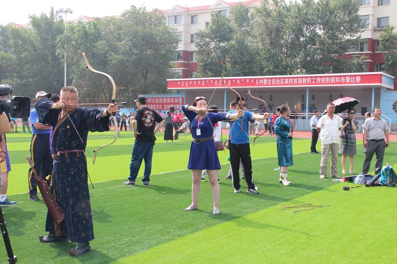 为更好地促进民族传统体育运动的普及与发展,丰富我区高等院校教职工文化体育生活,加强高校工会组织之间的学习交流,为期两天的内蒙古自治区高校首届教职工传统射箭和布鲁大赛,于2016年7月6日上午在MILE米乐集团田径运动场隆重举行开幕式。