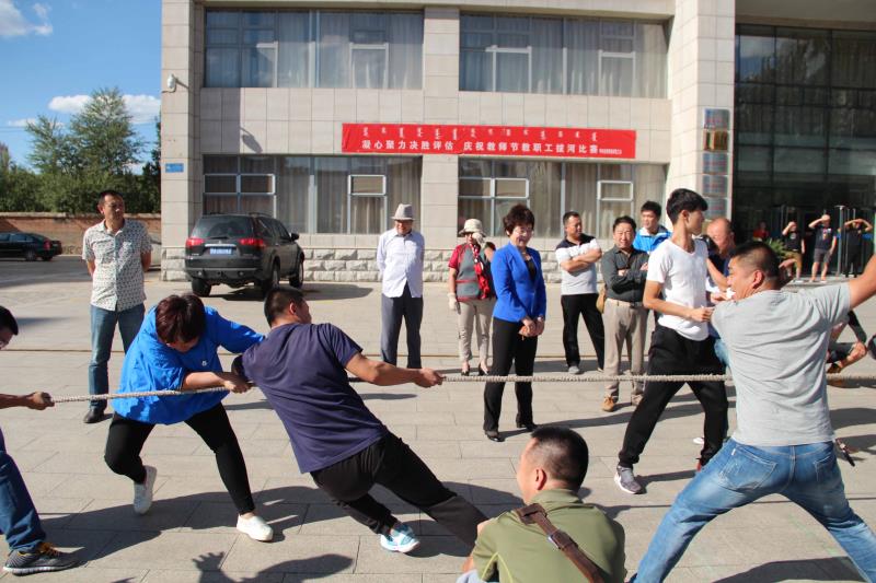 为庆祝第32个教师节,校工会于9月8日下午在综合楼前举办“凝心聚力决胜评估,庆祝教师节”教职工拔河比赛。学校党委副书记胡春梅亲临现场,来自各分会的8支队伍共120余名教职工参加了比赛。