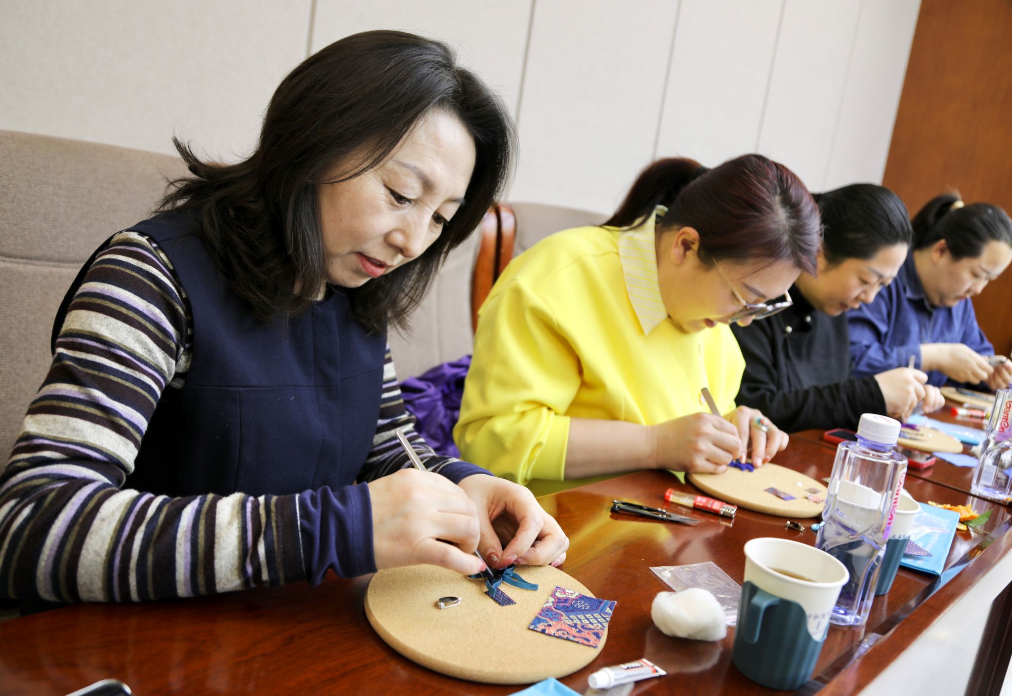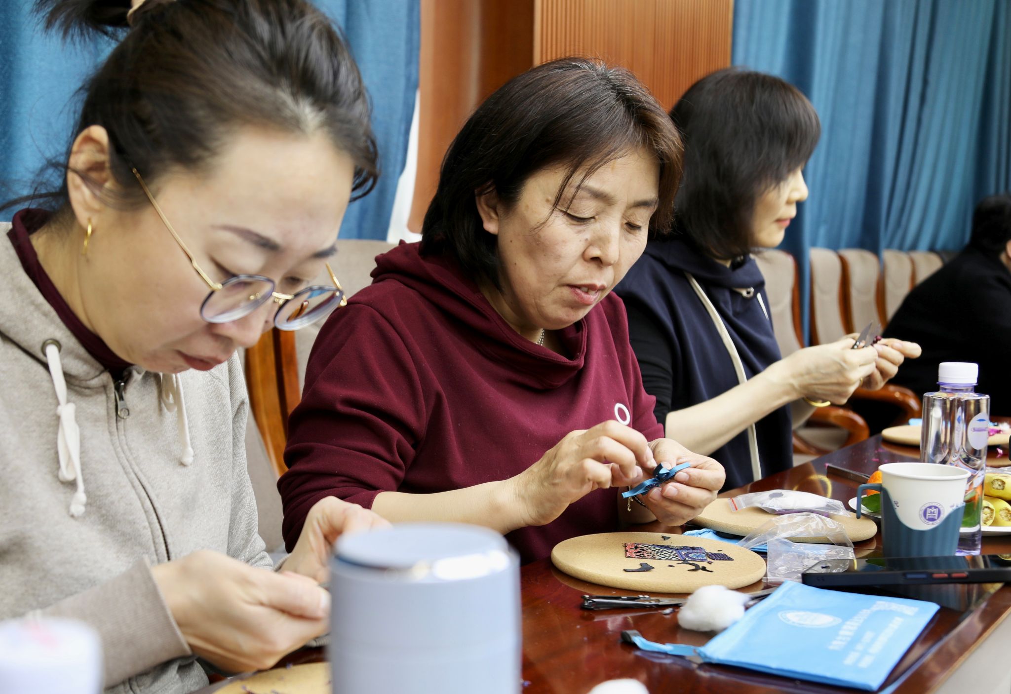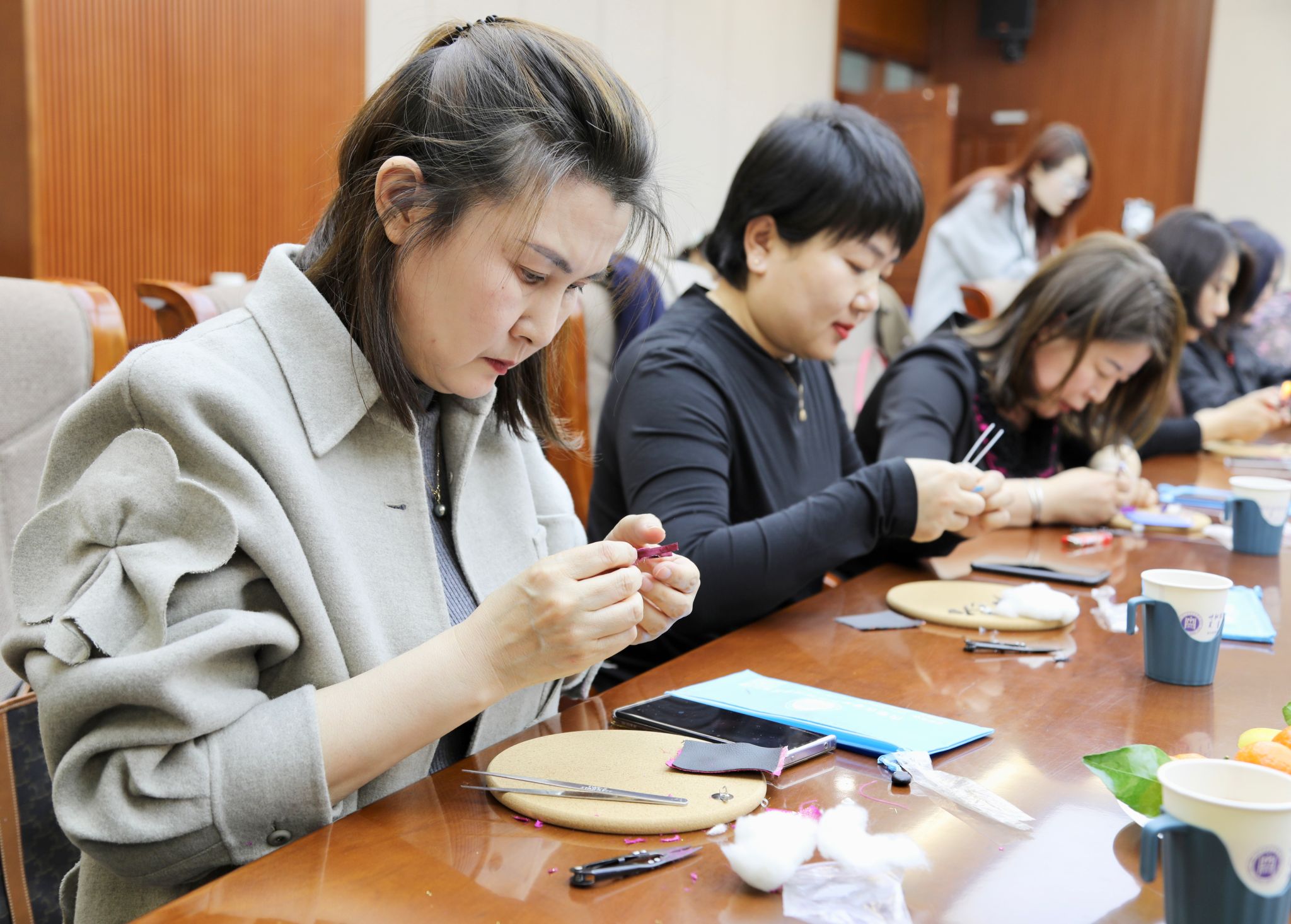 在实际操作环节,女教职工们热情高涨,纷纷拿起丝线、布料和工具,在刘瑞红的耐心指导下,开始尝试制作盘扣。大家一边认真聆听老师的讲解,一边动手实践,遇到问题时相互交流、探讨。现场气氛活跃,充满了欢声笑语。经过一个多小时的努力,一颗颗精致的盘扣在女教职工们的手中诞生。盘扣造型别致,宛如翩翩起舞的蝴蝶,彰显着独特的个性。女教职工们拿着自己亲手制作的盘扣,脸上洋溢着喜悦和自豪,纷纷拍照留念。