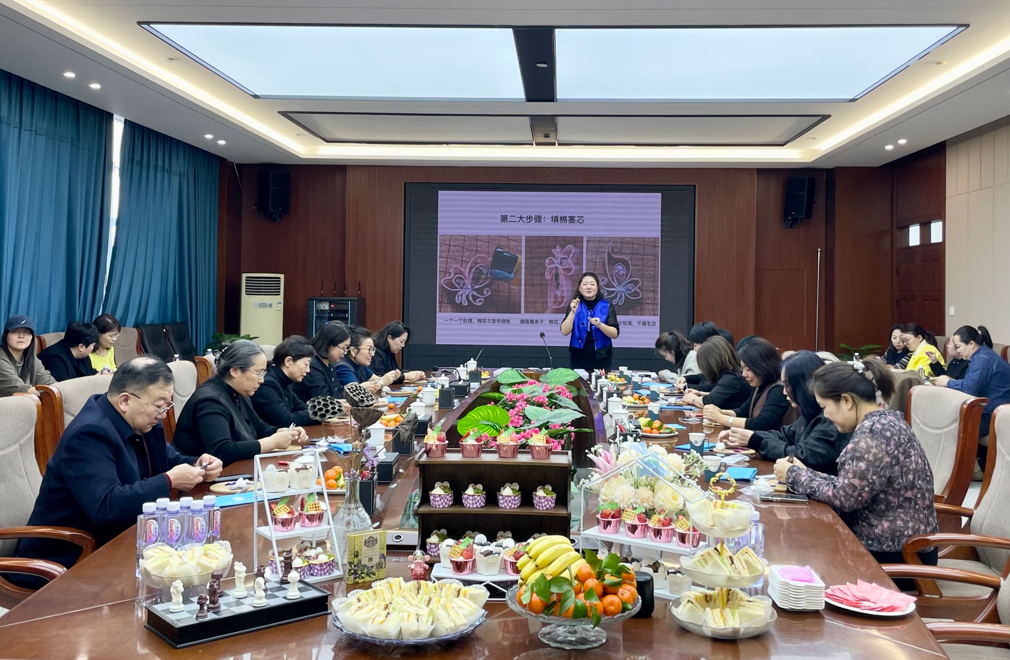 活动伊始,非遗手工盘扣传承大师刘瑞红为大家详细介绍了盘扣的历史渊源、文化内涵和制作方法。盘扣作为中国传统服饰的重要元素,承载着丰富的历史文化信息,是中华民族智慧的结晶。刘瑞红通过实物展示和现场演示,生动地向大家展示了盘扣从一根丝线到精美饰品的制作过程,让女教职工们对盘扣这一非遗技艺有了更深入的了解。