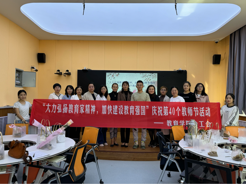为庆祝第40个教师节教育学院于24年9月10日上午在逸夫楼多功能教室开展“大力弘扬教育家精神,加快建设教育强国”主题活动,活动现场老师们亲手栽种的一花一木,一草一木,不仅是对自然界生命奥秘的探索与致敬,更是对学生们成长之路的深刻隐喻,正如老师们以无尽的耐心与智慧,悉心浇灌每一颗求知的心田。以盆栽形式传达对老师们的美好祝福。