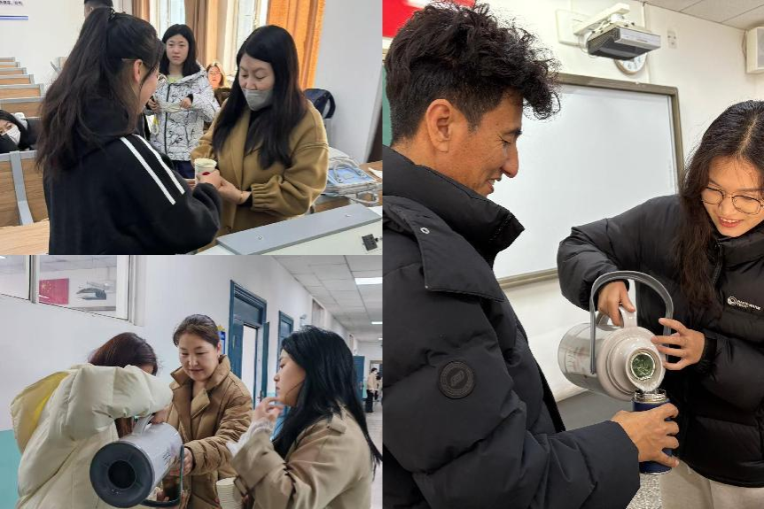 同时,一部分党员利用课间走进教室为上课的老师们送上一杯热气腾腾的茶水,为辛苦上课的老师门送去春日里的“温暖”。
